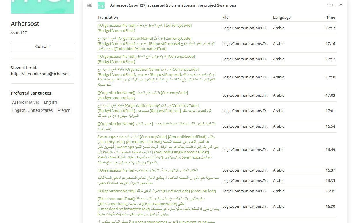 The total words count for this project is 11 547 and i have contributed in this part 882 words with 22 of static words on avreage, in total will give us 860 words, in total 17151 Words Translated but only 5376 words accepted.Languages