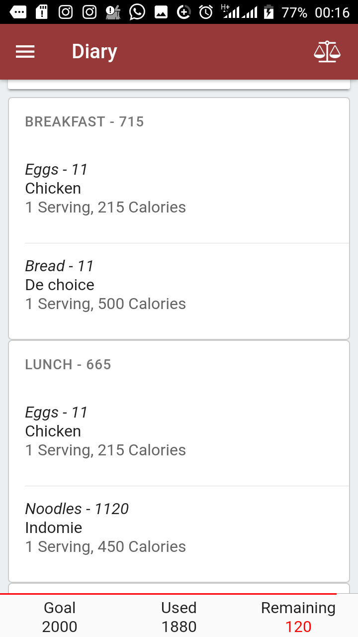 The diary is where you add the food you ate for breakfast, lunch, and dinner. It usually shows you a daily target amount of calories you are to take for that day. In my case, am still short of 120 calories for today. I better go eat that burger!