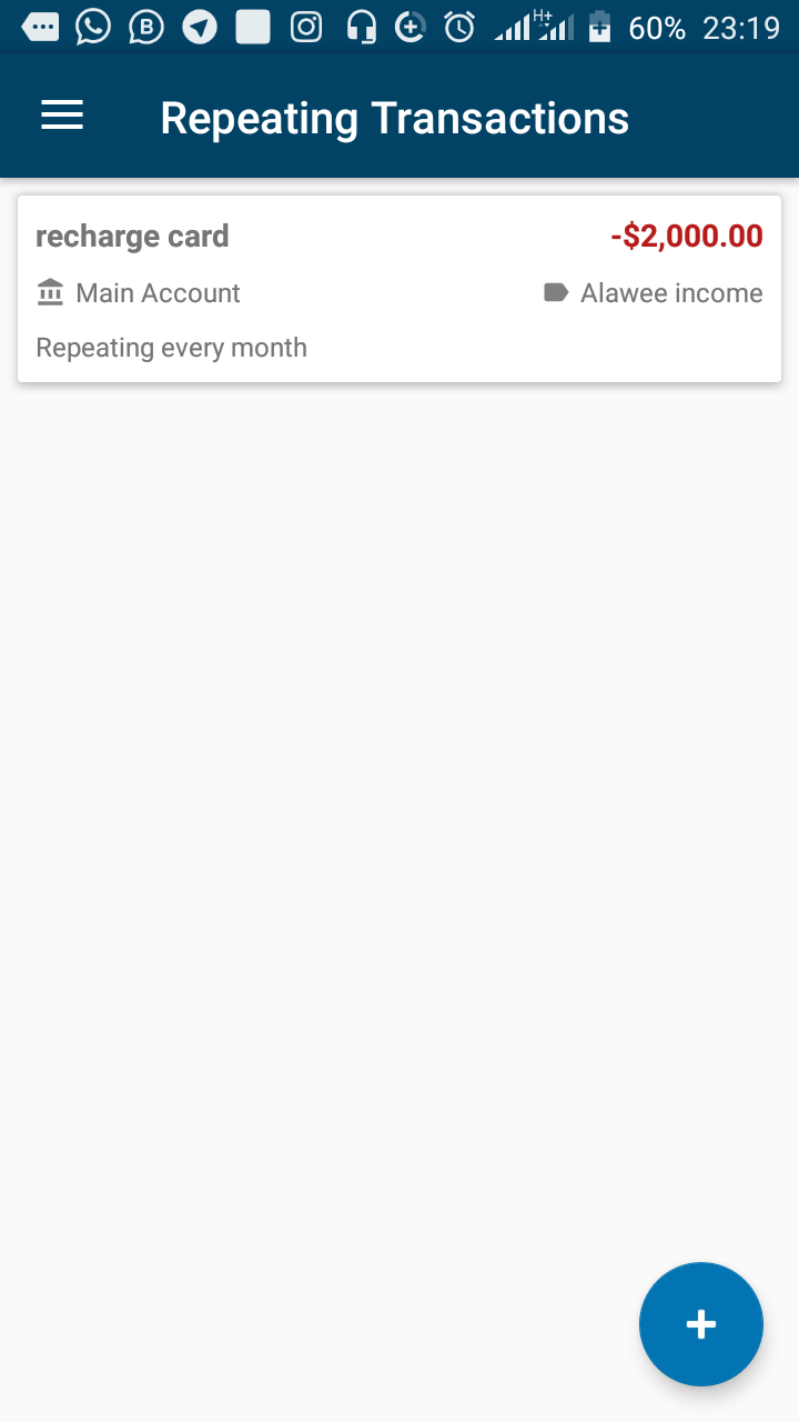 Personally speaking, I have lots of repeating transactions I do carry out daily, some on a weekly and some are monthly. So instead of entering these transactions every time you carry it out, instead, you add them to this category. This way, they are being deducted from your total balance at the specified intervals (in the case of expenses) or added to your total balance (in the case of income). I find this to be really helpful because I get to see how I’m doing financially on a day to day basis and it always propels me to improve, to get more inflow of cash.