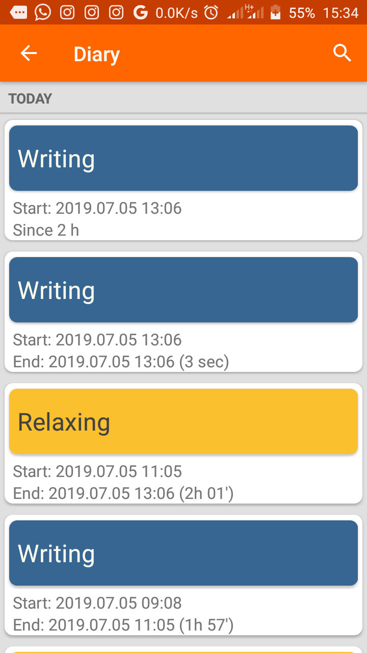 This is another primary feature of the app. Here I get to see all the past activity entries. The entries are listed and color-coded according to the activity. Just by scrolling through, I can see how much I frequent most activities. The activities with the most frequency are; writing and relaxing. This is because I’ve been at home for the past few days. I’m a teacher and my students are in their holiday season. So I’ve been getting a lot of free time lately.