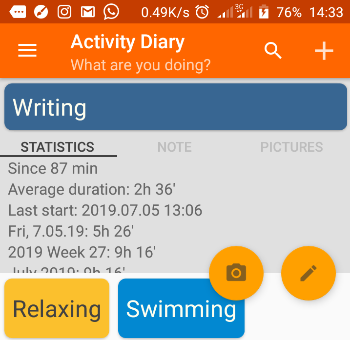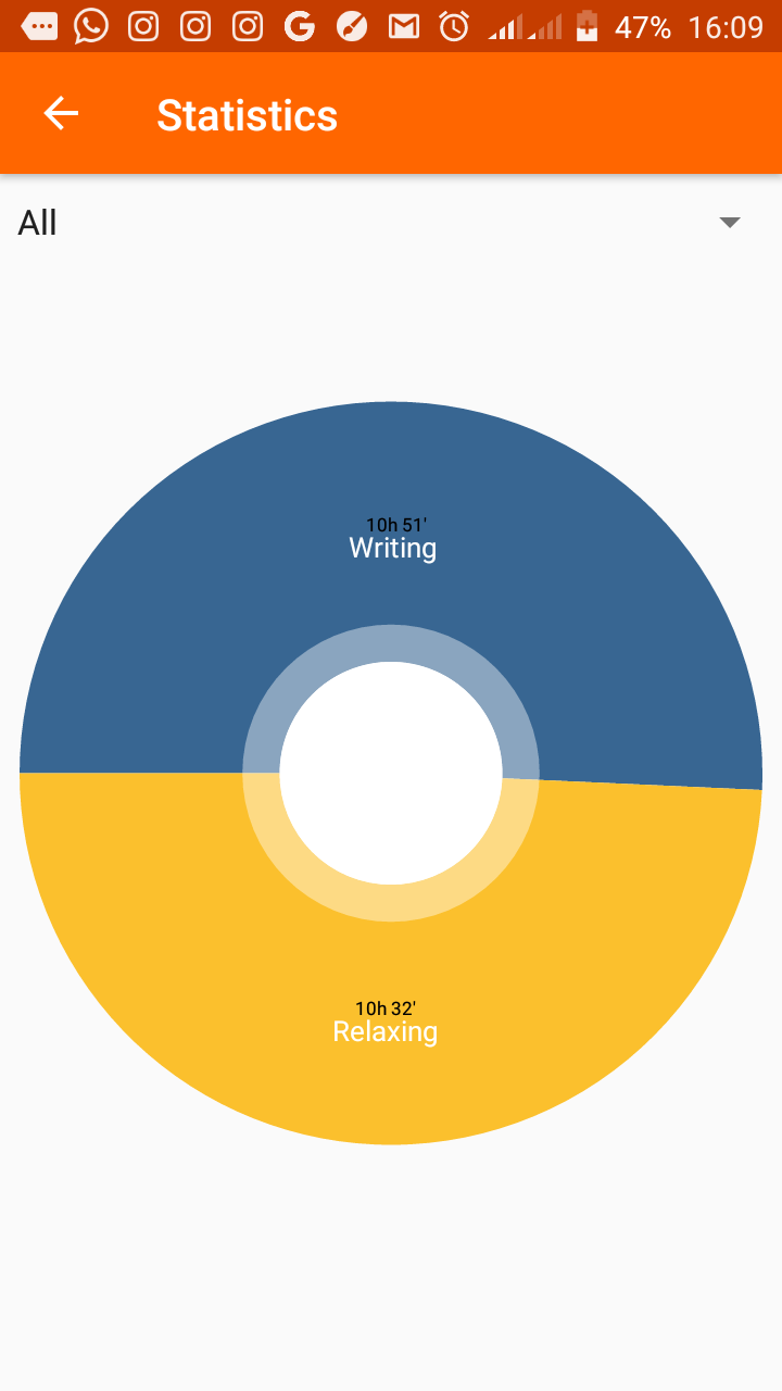 This feature gives a general overview of the activities entered over time. The feature is really helpful. Most times, we repeat a lot of activities without really taking note. The features show how much time is being spent on every activity. One can better organize and maximize time allocation for different activities. It also shows the average time spent on each activity. It displays it in the form of a pie chart. From the screenshot of my phone, I’ve spent 10 hours, 51 minutes writing, and 10 hours, 31 minutes relaxing. Of course, the stats aren’t entirely true. I do forget to end the activity and enter new ones sometimes.