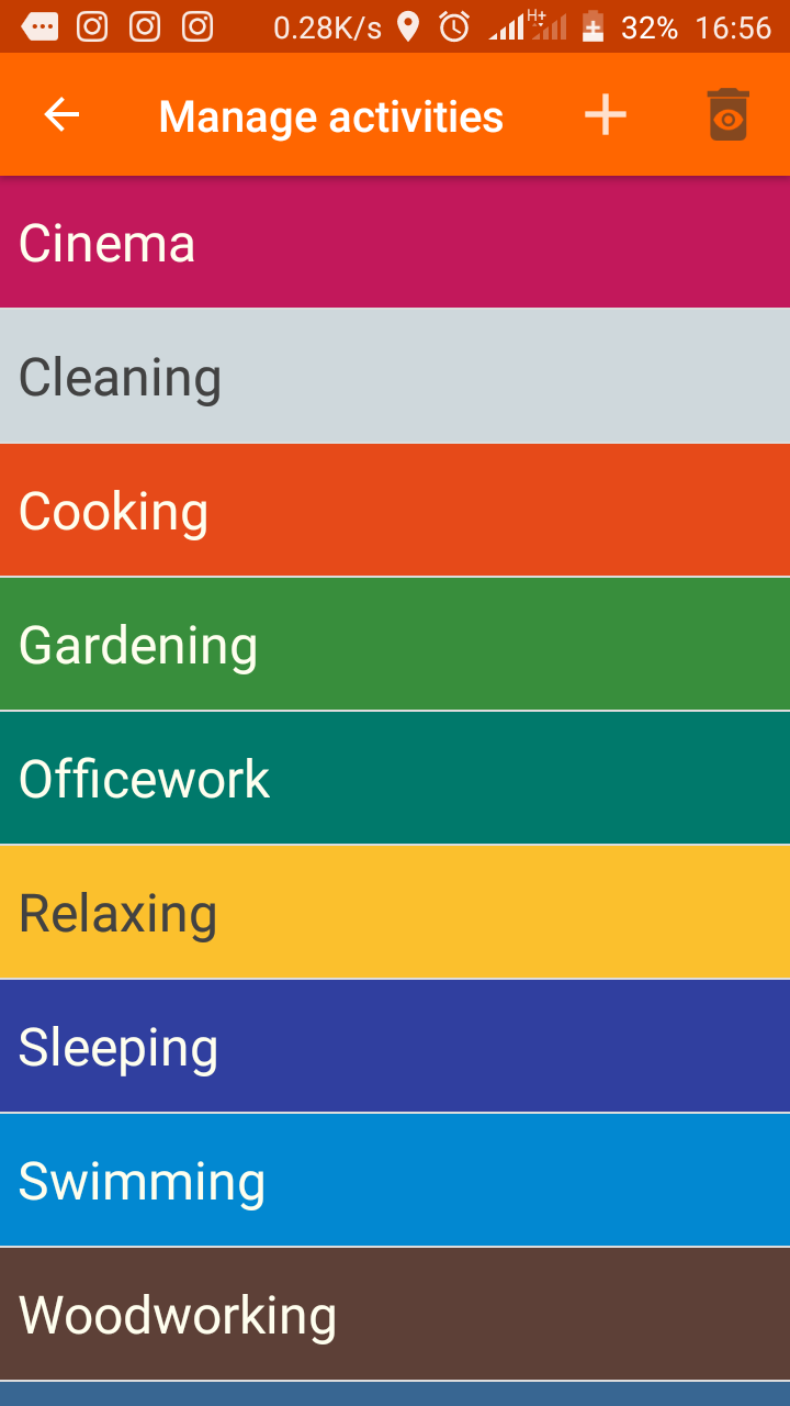 Clicking on this feature displays all the activities you’ve added in a list. You can edit or delete any activity from the list. I was able to change the color code for “writing”. An activity I created earlier. I was also able to delete some of the default activities. I don’t carry out woodworking, I don’t think I’ve done any woodworking activities recently. So, I had to delete it along with gardening.