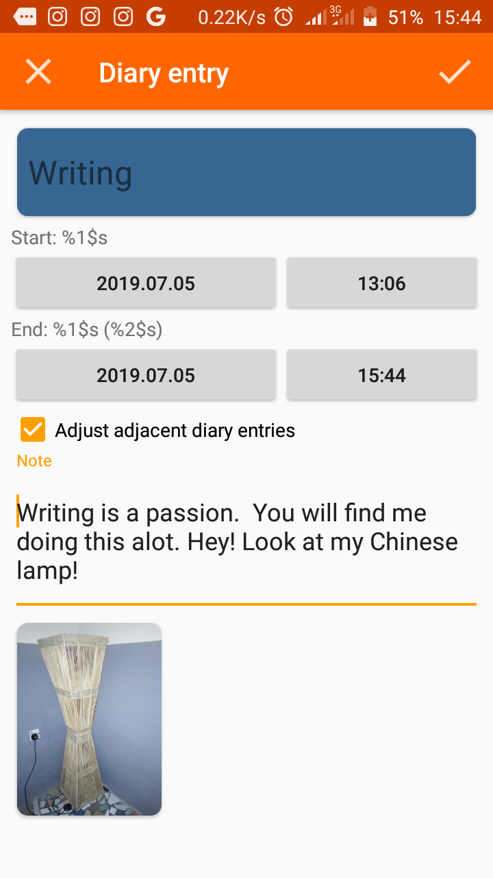 On opening the diary entries, it displays the start/end time of the activity. The notes, and the pictures are also displayed on the note.
