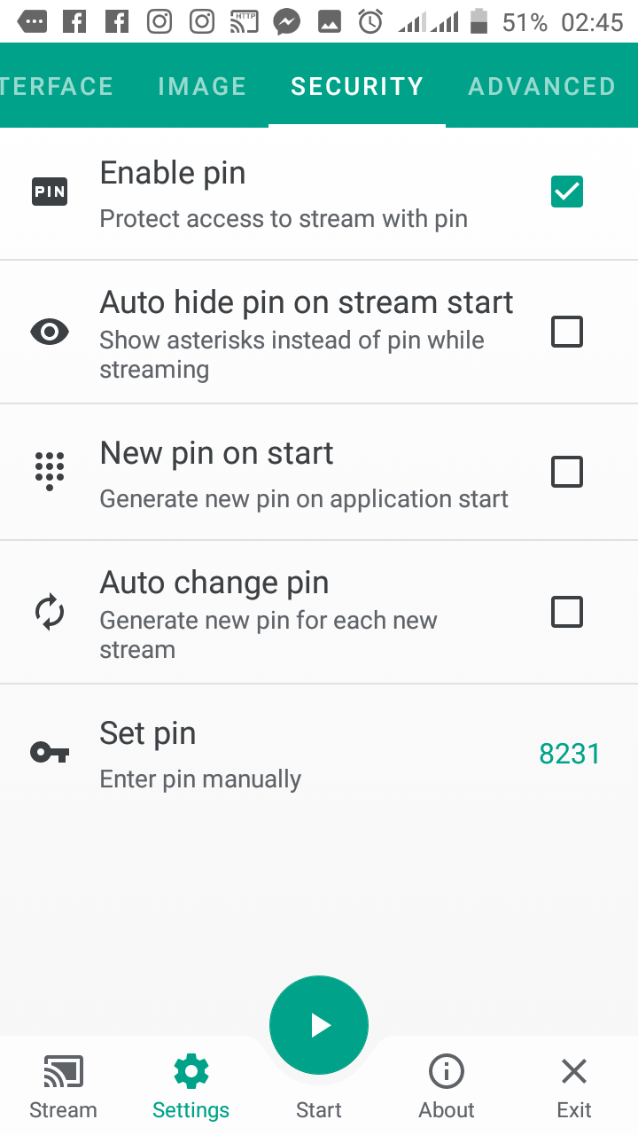 My favorite security preference is the auto change pin. This means that a new pin will be generated every time you start a new stream. This way, I’ll be sure that my device screen cannot be easily hacked. While the “new pin on start” generates a new pin on application start.