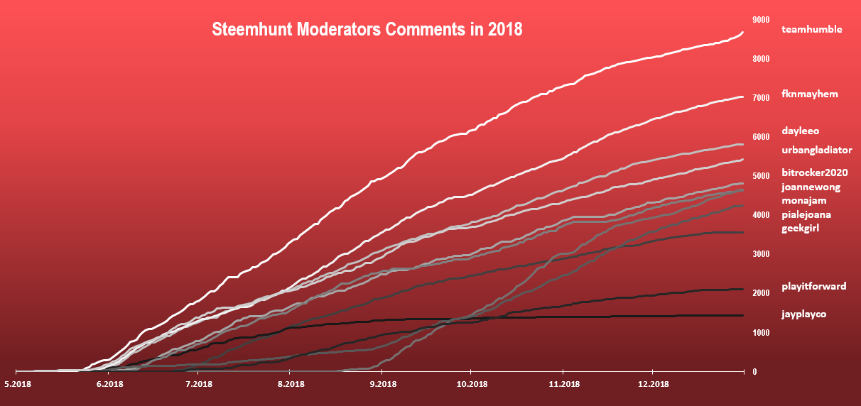 The absolute champion is @teamhumble! He have made an almost 9000 comments. Next to him is @fknmayhem with 7000 comments, and third is @dayleeo with 5800 comments. @monajam is interesting. She seems to started a bit late, but did an amazing job and ended the year with around 4600 comments, which put her in the middle of the ranking.