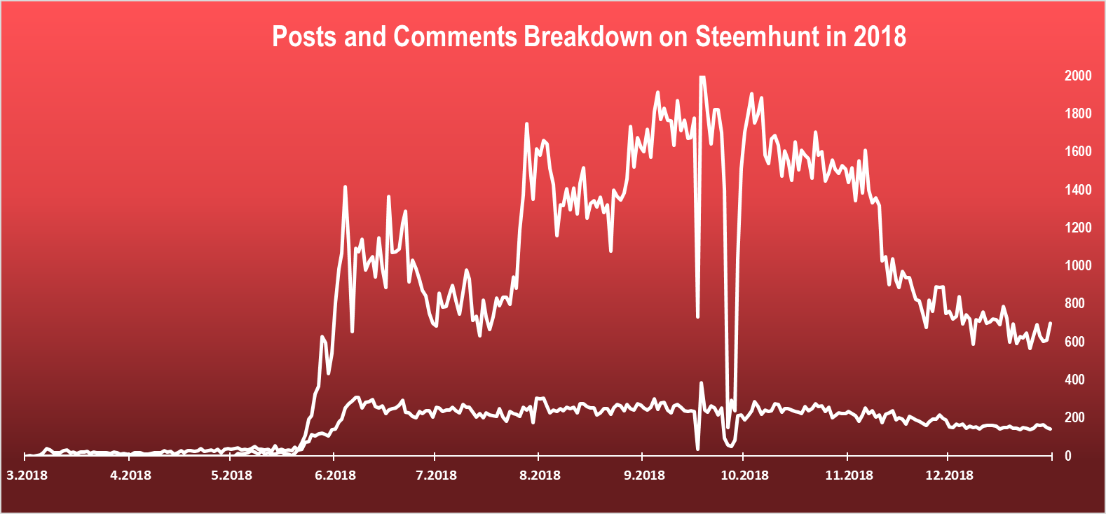 The chart represent the number of unique users, not a daily or monthly active ones. We can see that new users continued to arive to the platform in all of the 2018. The biggest growth is in June , and then it is steadily growing till the end of the year. In the last quarter of the year a total of 600 new users posted from the Steemhunt platorfm. This is a great achivment for the period, having in mind that the price of crypto droped masivley.
