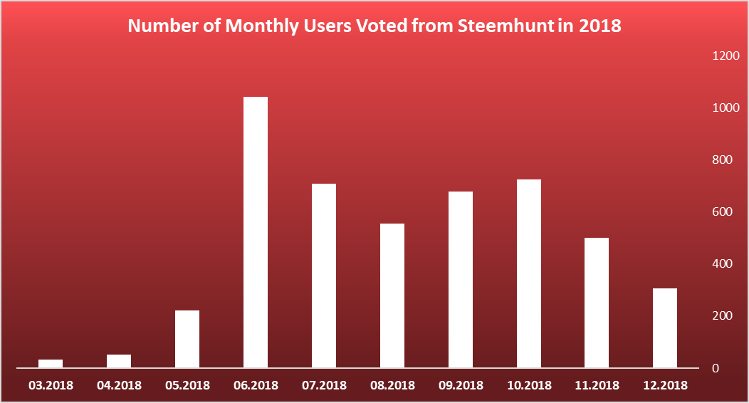 This is a great number of users supported by Steemhunt. Here we can see a sharp increase in the number of users suported by Steemhunt in June 2018. After that it stiblizes it self around 600 monthly users suported by Steemhunt, and the last two months of the year there is a drop and in December 2018 this number is around 300. This drop is again becouse of the change in policy of the comments voting.