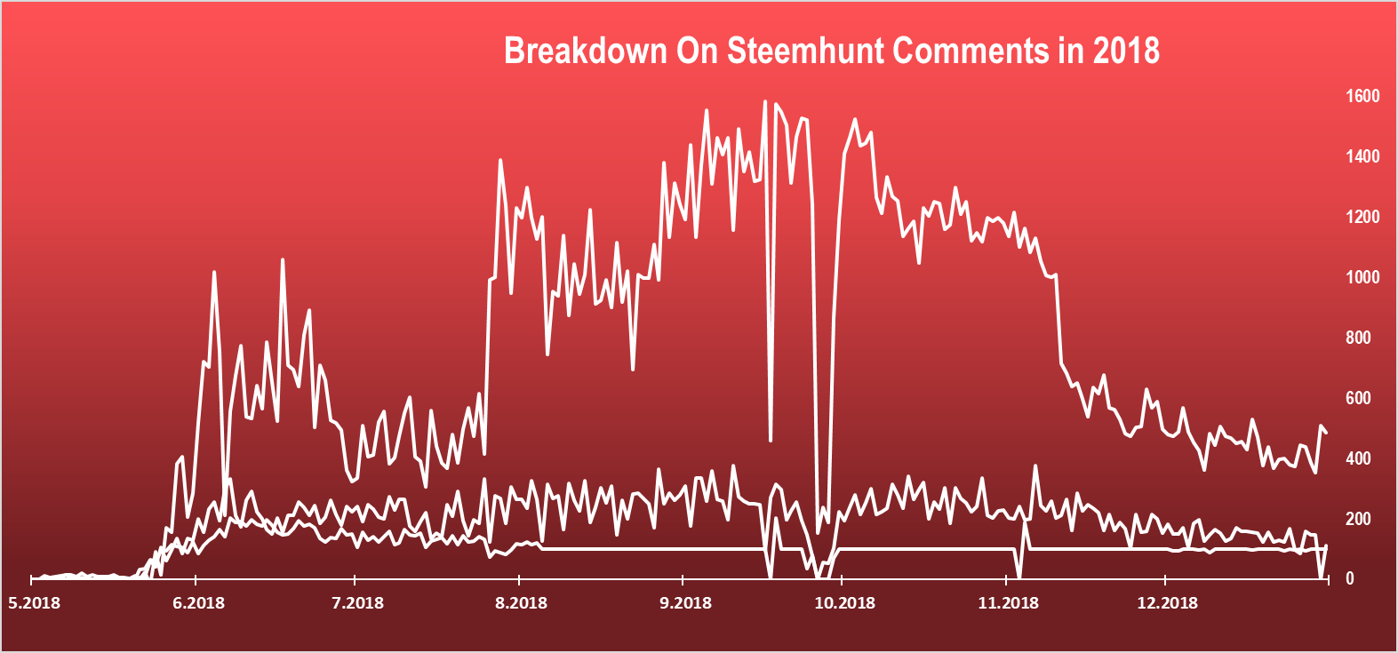 The upper line represents comments from users, the middle one moderators comments, and the lower one Steemhunt comments.