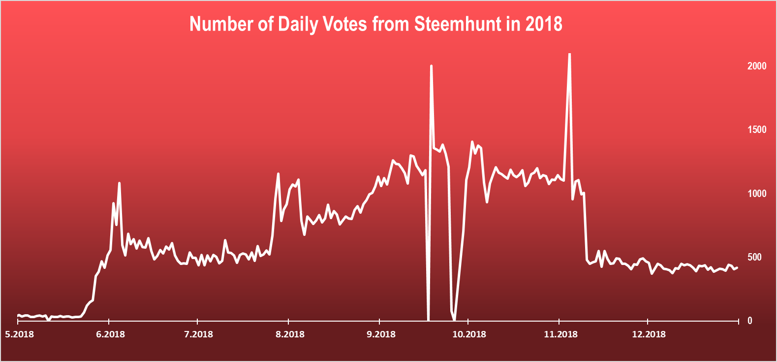 From the chart we can see that the number of votes increased a lot at the end of May, after what it stabilized it self around 600 daily votes, growing steadily until November. After November we can see a sharp drop in the number of daily votes. This correlate with the number of comments made. It is because of the new voting system for comments that was introduced. After this the number of daily votes from Steemhunt remained the same until the end of the year. Just below 500.