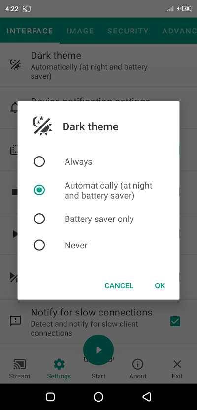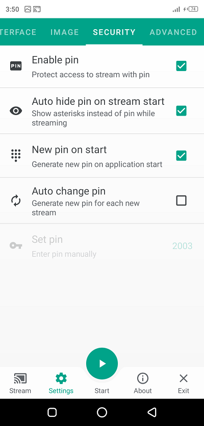 The Security page also had other options for me to explore. Options like automatically generating a new password on each application launch were commendable. This means nobody can brag of having continual access to my stream since a new password comes up every time I launch the app.