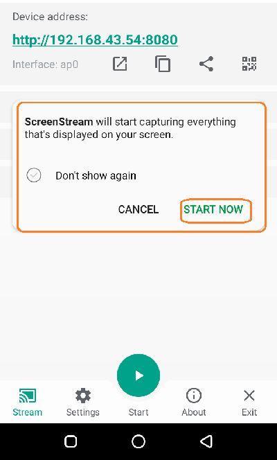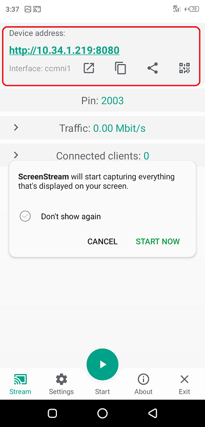 A pop-up with the message ‘ScreenStream will start capturing everything that’s displayed on your screen’ will appear. Click on the ‘start now’ as shown below.
