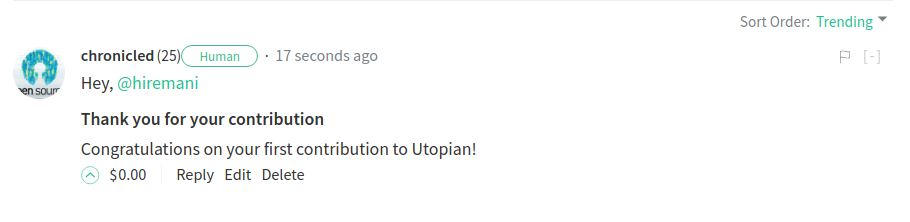 If contributor is new and created first contribution bot will say "Congratulations on your first contribution to Utopian!".