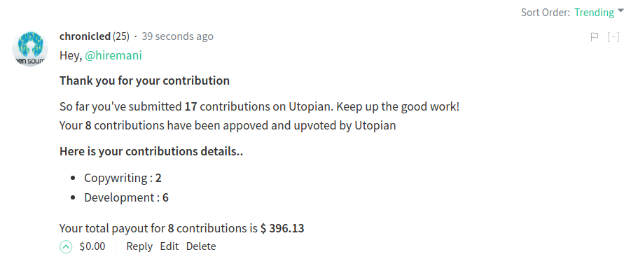 This new tiny bot at @chronicled is basically provides previous contribution statistics on utopian. Bot make a comment on contribution post with welcome message along with category wise contribution done so far. And also provides info on how many contributions have been approved and upvoted by utopian with total payout. I feel it gives much insights to contributors about his/her contributions.