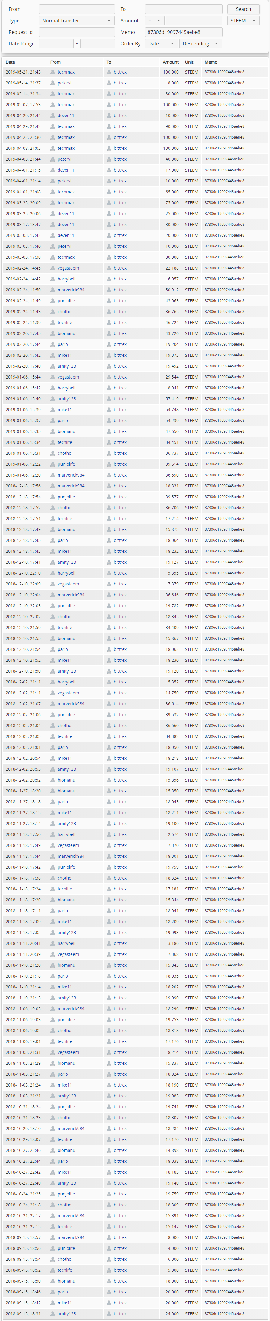 Thus, we can see who's using (and who used) the bittrex account marked by memo 87306d19097445aebe8: