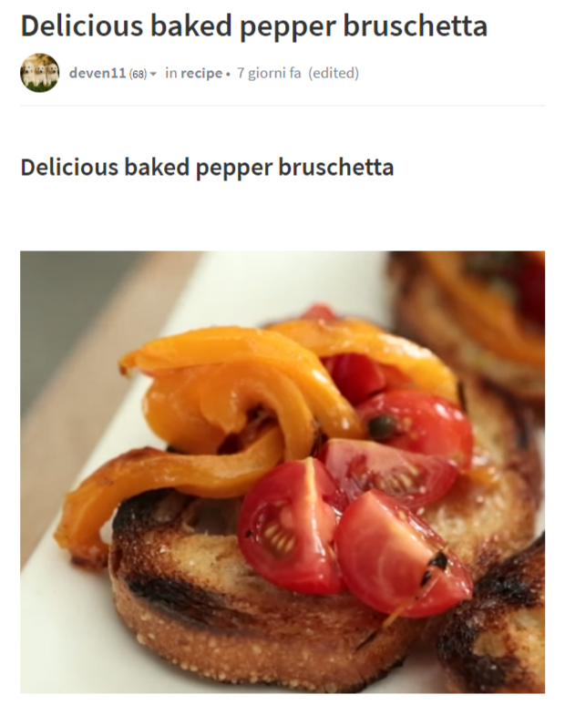 Here is the “delicious bruschetta with peppers” by @deven11: stolen from Youtuber Sarah Carey (min. 3:56)