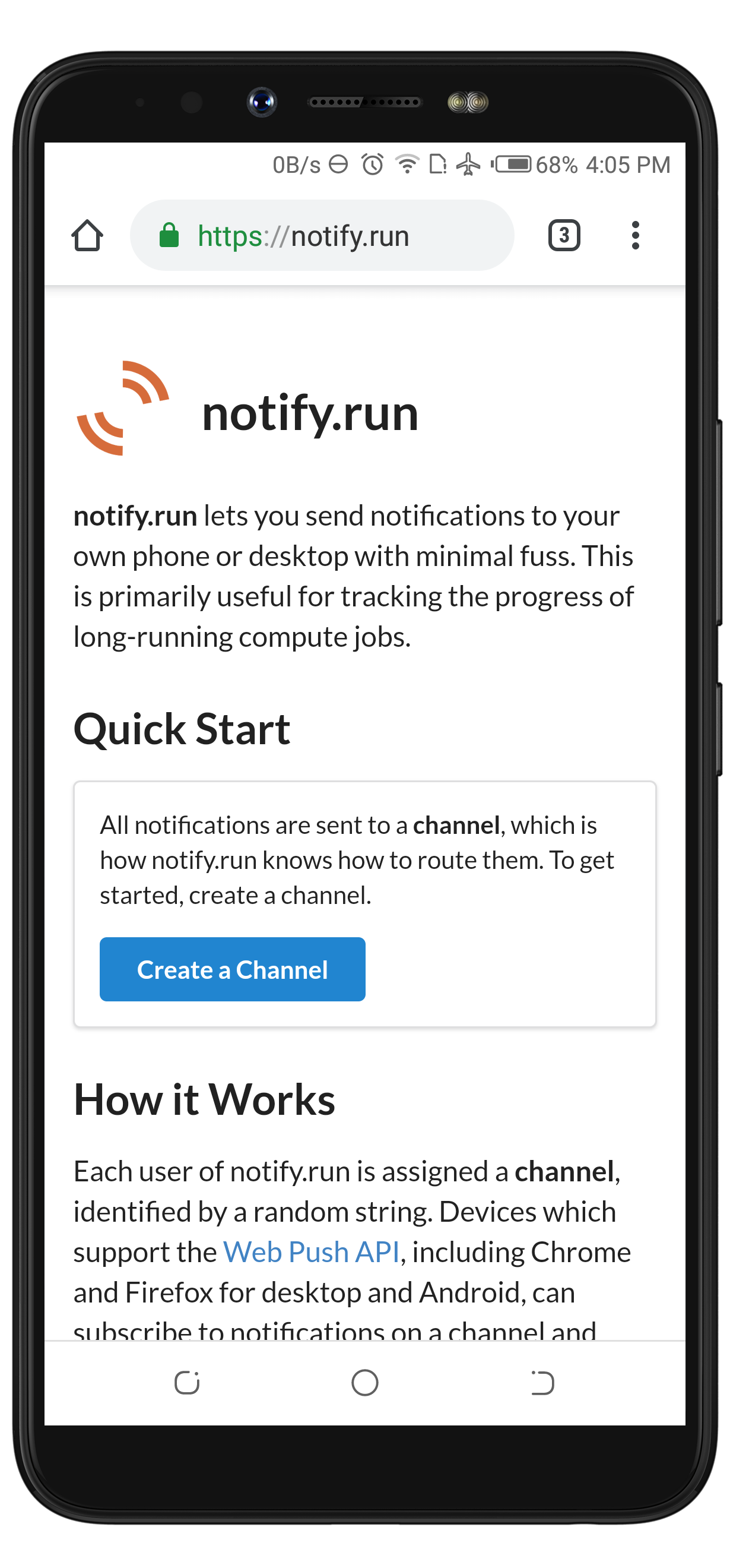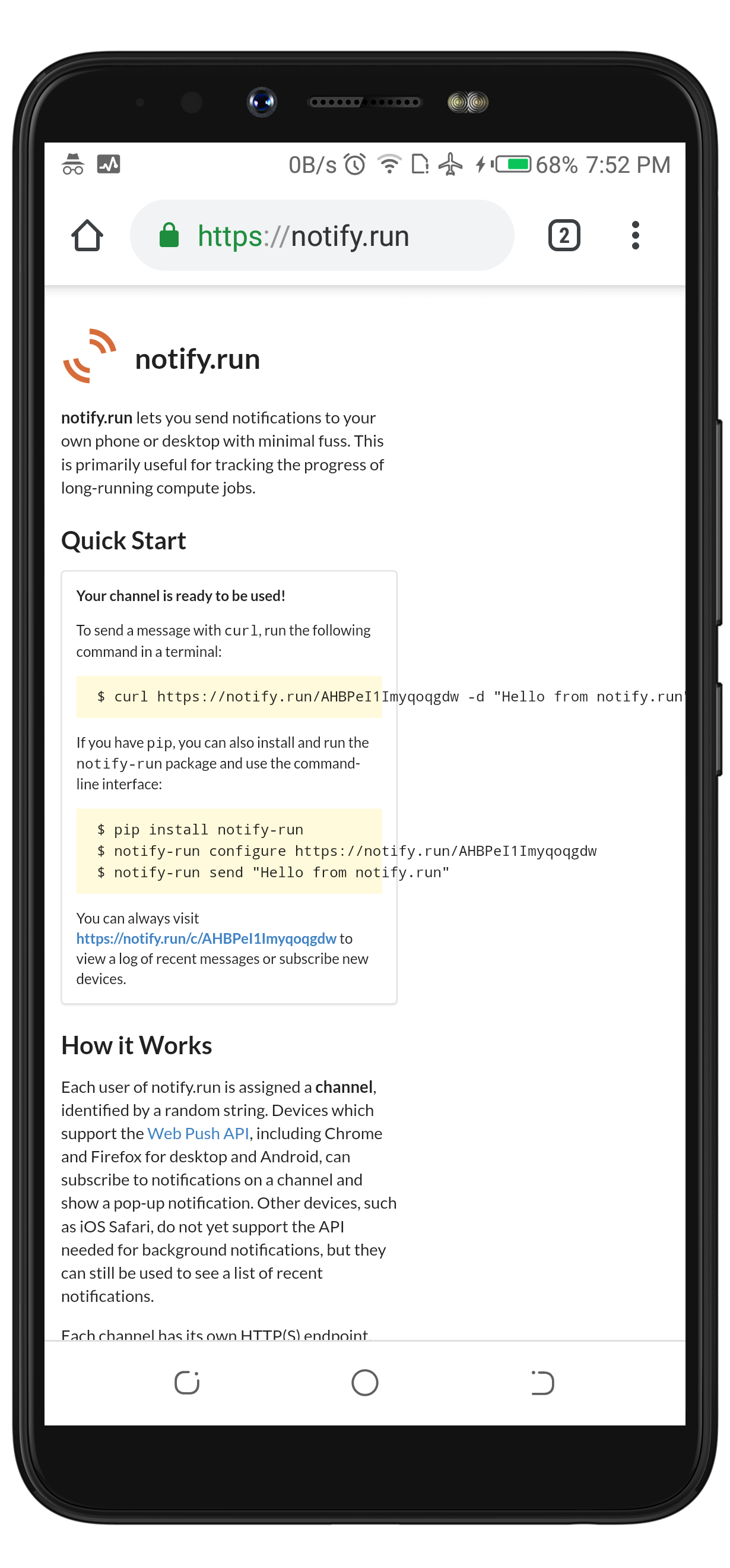 Notify.run is one of the best Web Push service provider out there on the net. It's free to use, it doesn't request personal details to set up a channel. Another interesting feature of Notify.run is that it gives a Channel owner the opportunity to host their channel link(s).