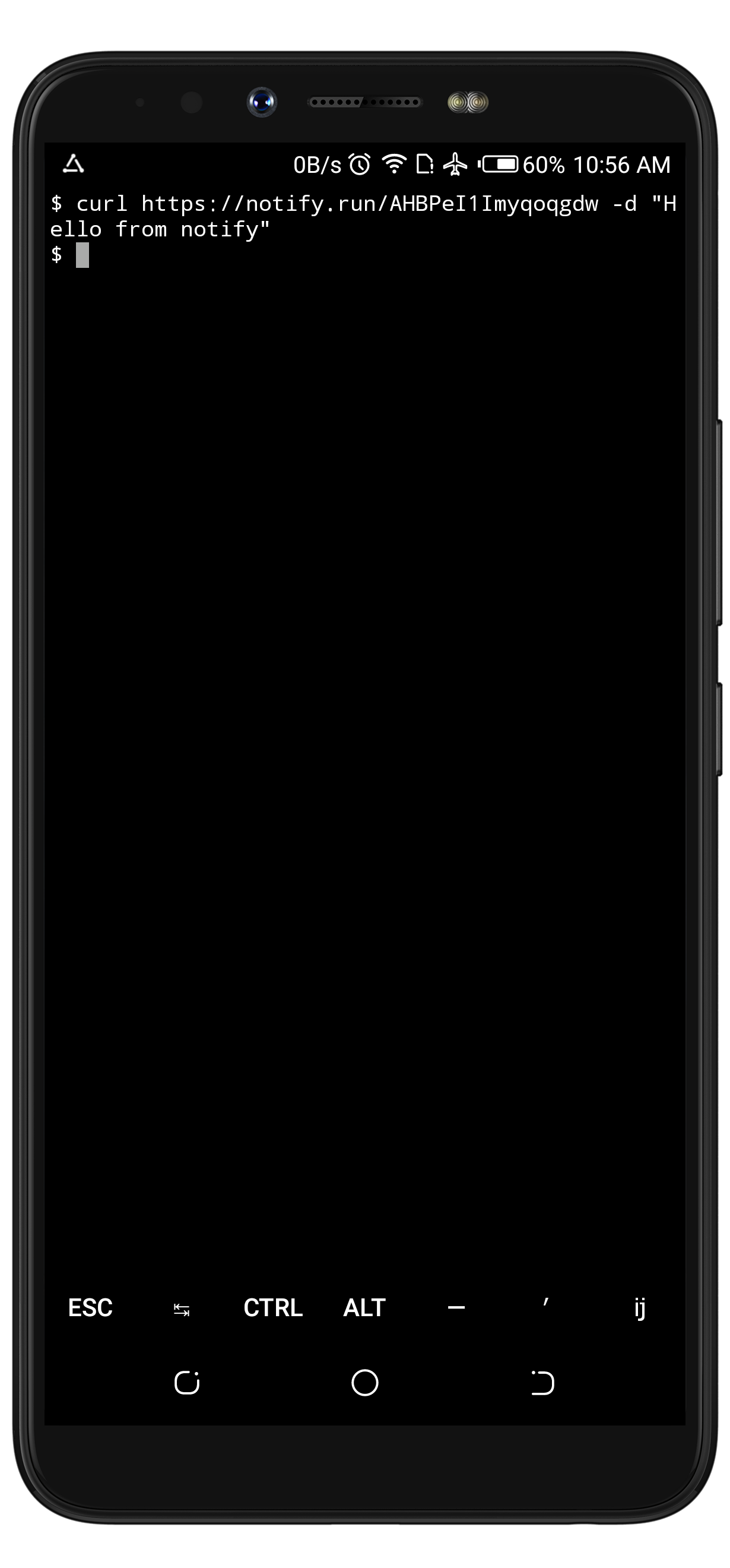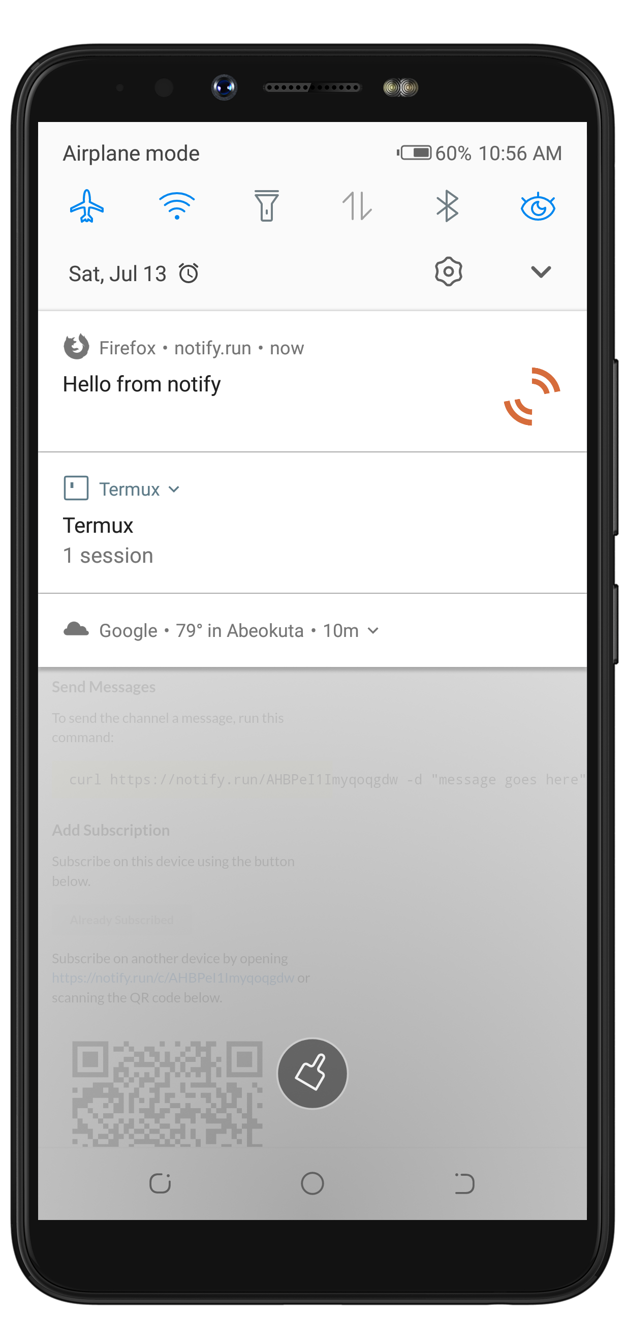 $ pkg install notify-runTo successfully push a message to my subscribers via Termux, I have to run this code $ curl https://notify.run/AHBPeI1Imyqoqgdw -d "Hello from notify.run"on my Termux workspace.