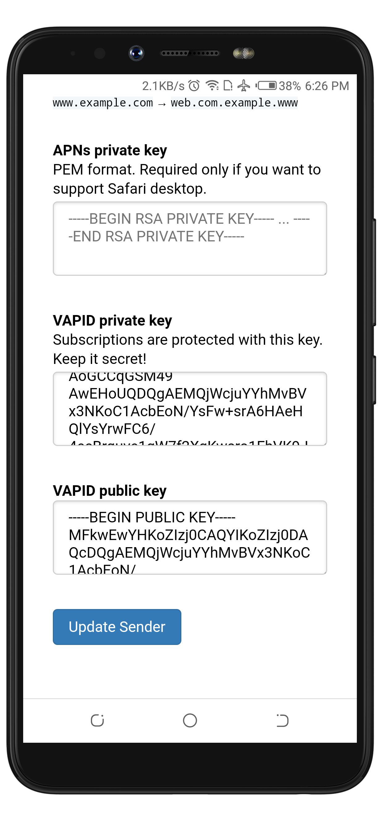 On its competitor's page, the channel is known as Sender. The sender is known as the owner of a group of subscriptions which is similar to channels in the case of Notify.run After I created a sender, it didn't give me a link or QR image to access the Sender. Instead, it displayed a public and private key as shown in the image below.