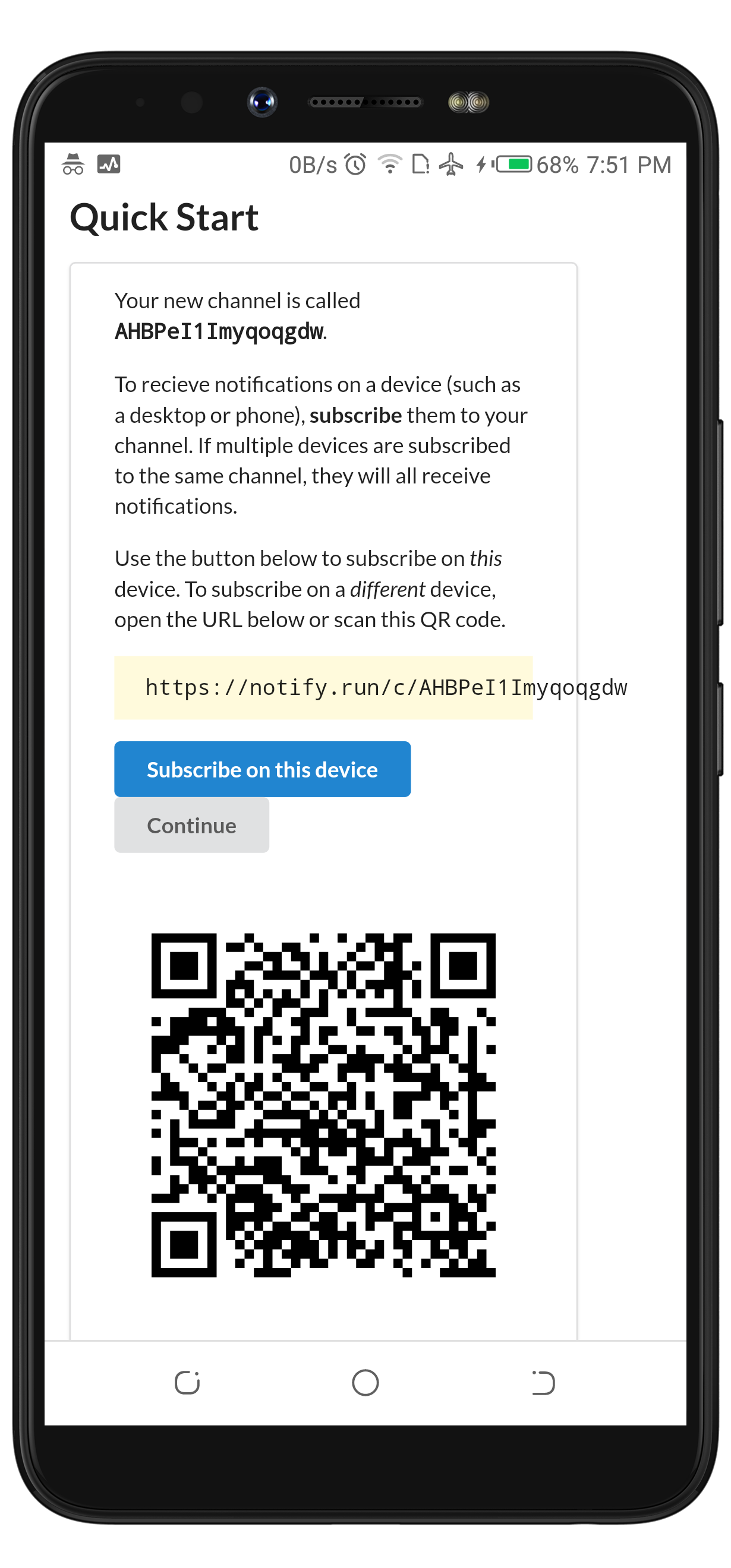 The only requirement to successfully create a web push account with Notify.run is to click on the Create channel button. As seen in the previous image, it displayed the name of the channel as AHBPeI1Imyqoqgdw, provided https://notify.run/AHBPeI1Imyqoqgdw as the link to access the channel, buttons to subscribe or to continue to the channel's dashboard, and a QR image for the channel which is displayed below.