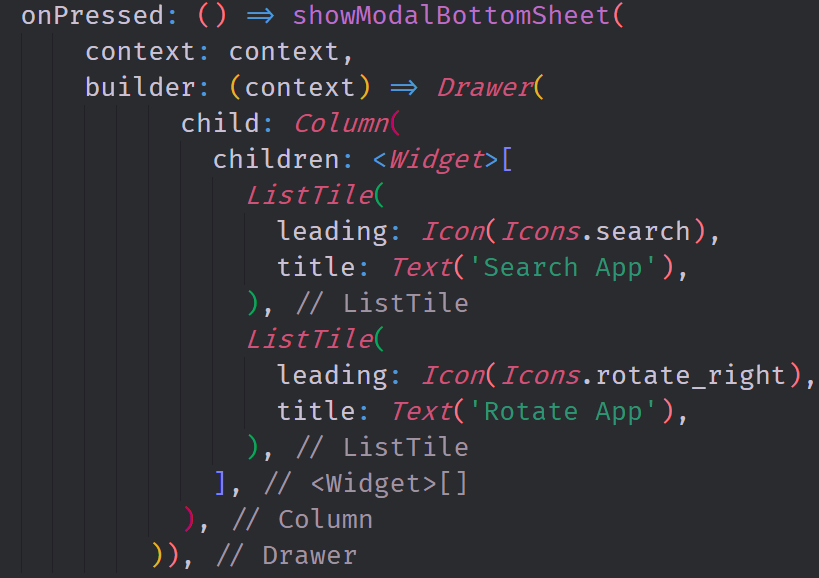 In this image, you can see the code that is used to actually launch this drawer from the bottom of the screen. We make use of an inbuilt function called showModalBottomSheet. This function allows us to create a builder function based on the context of the application. In the builder here, we build out a column with two listTile widgets inside of it to make it look a proper menu.