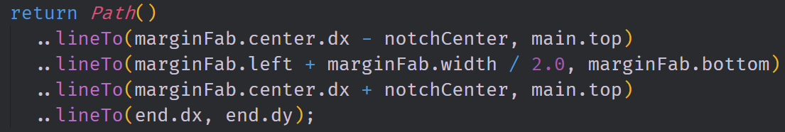 You can see the custom notch in this picture. We again use the Path object to create this notch and we draw a triangle with the path. This triangle is built by using the geometry of two separate rectangles; one from the floating action button's area and another based on the bottom app bar. We can make it look like it is cutting into the bottom bar by giving it no paint and making it into an "Open" shape.