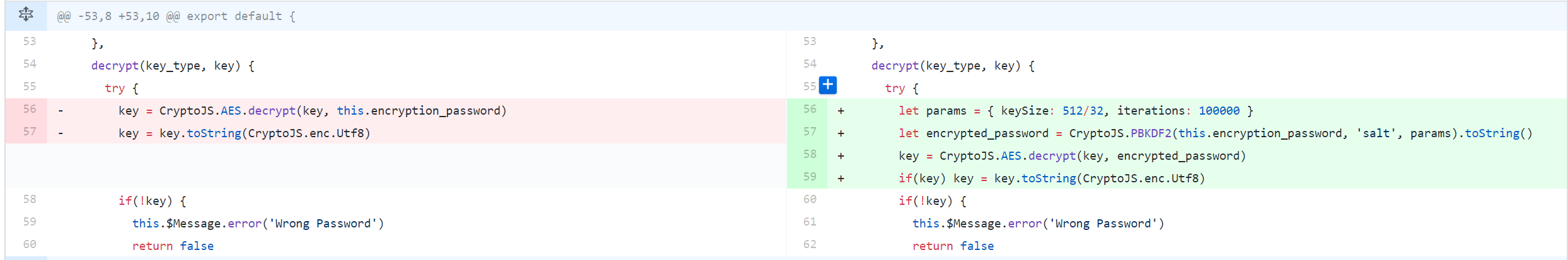 The encryption of private-keys saved locally has been improved to harden it against brute-forcing (due to feedback from @hernandev). Code see below: