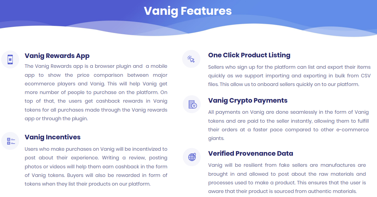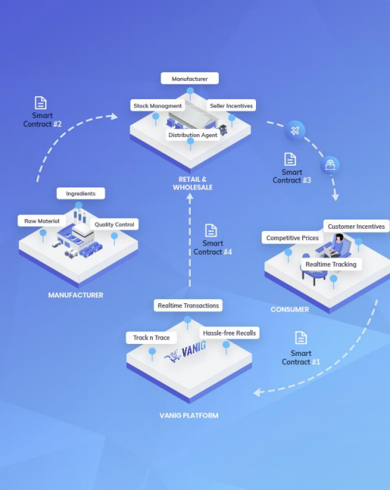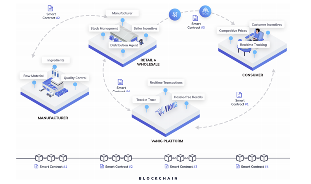 - Vanig is an integrated E-Commerce platform and Supply Chain Ecosystem that is powered by the blockchain. It is a known fact that Supply Chain has not evolved fast enough in today’s E-Commerce age. Vanig aims to solve that by addressing some of the significant issues plaguing Supply Chain for the manufacturers and sellers, and also equally important is Vanig’s E-commerce platform that will be a truly rewarding shopping experience for customers, as they will get good product selection, real reviews, save money, get rewarded, have access to product provenance information and track and trace, making shopping trustworthy again.