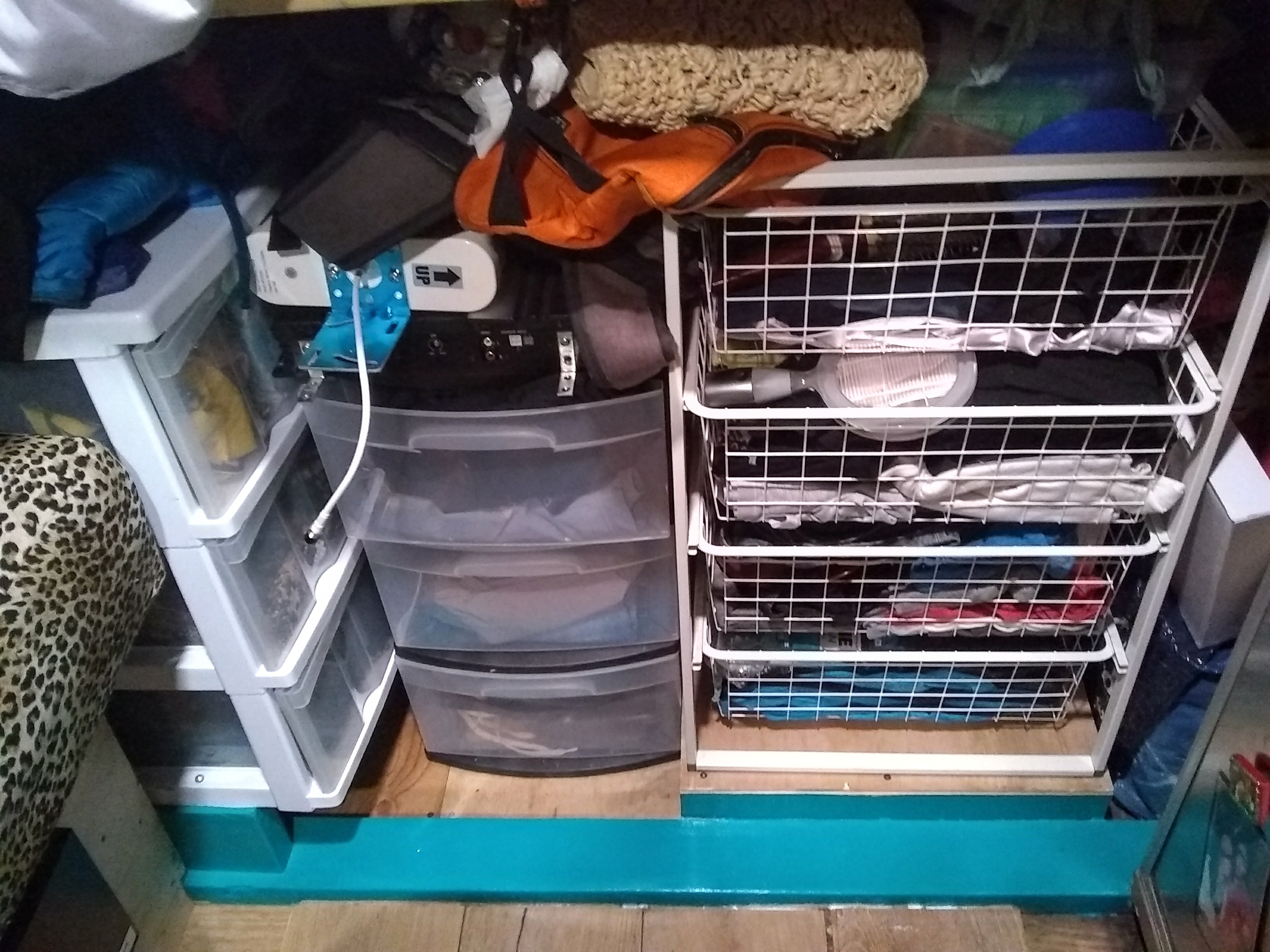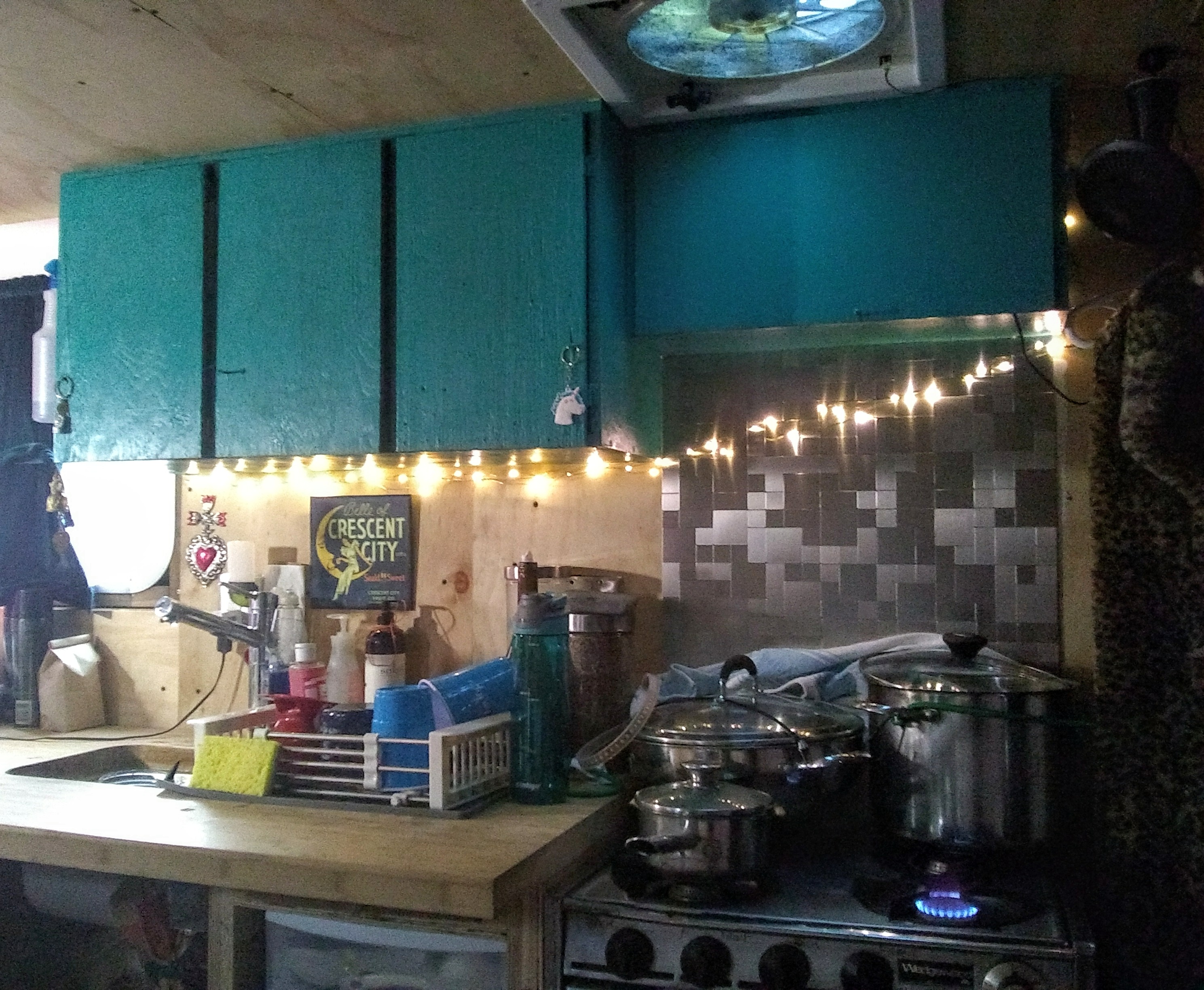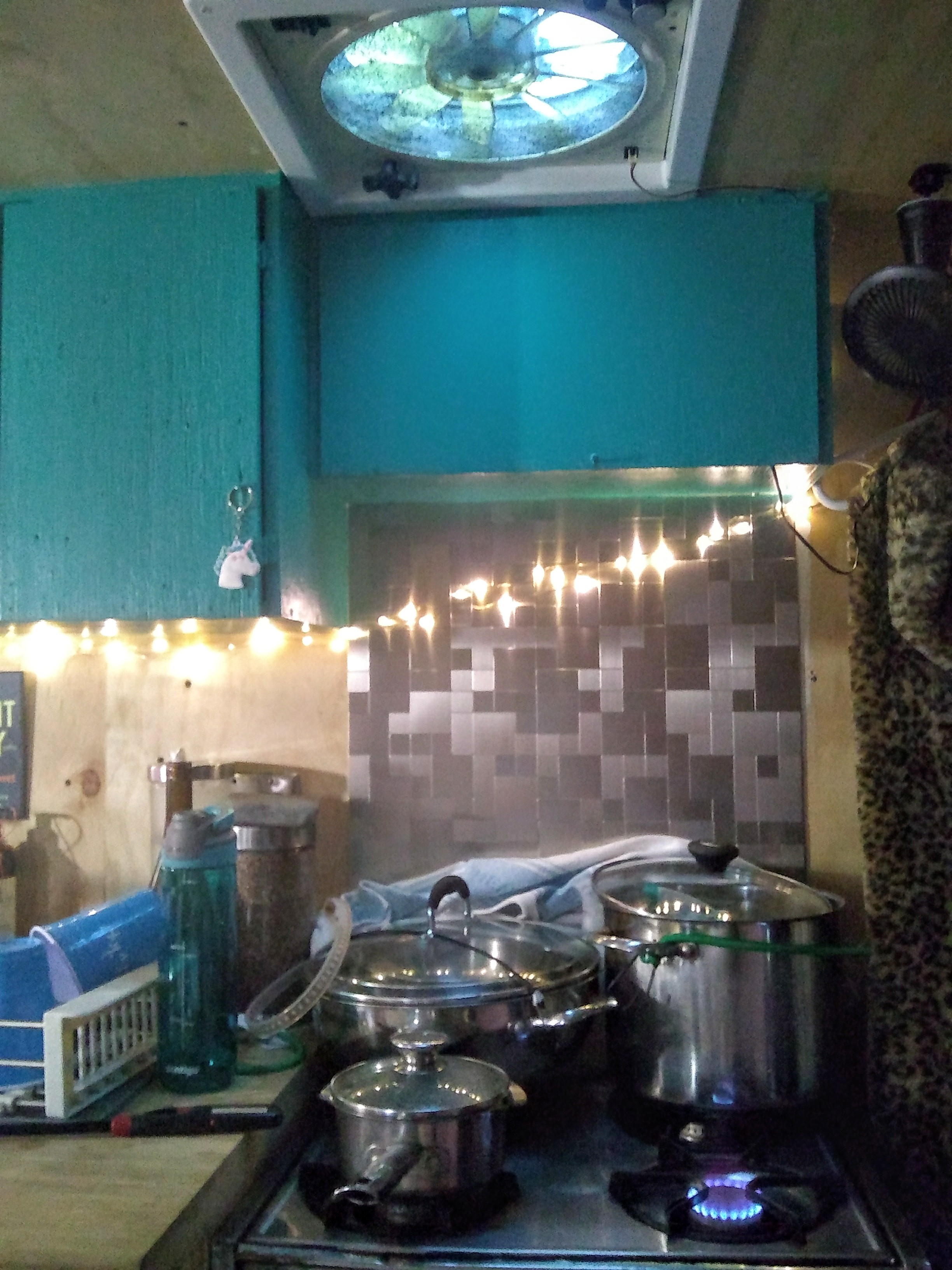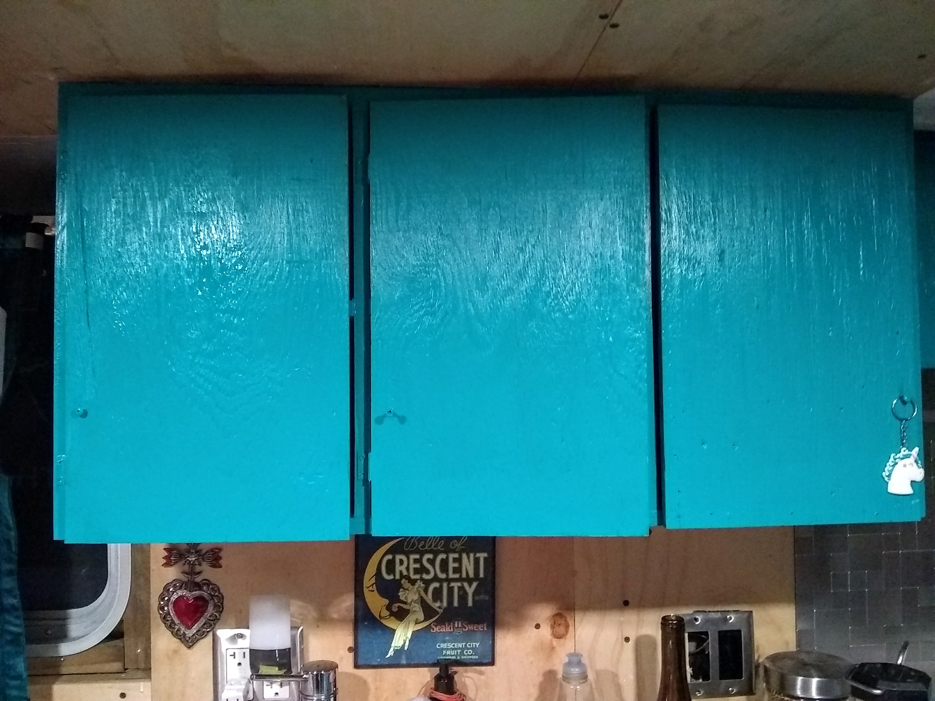 We added turquoise to our cupboards and shelving: