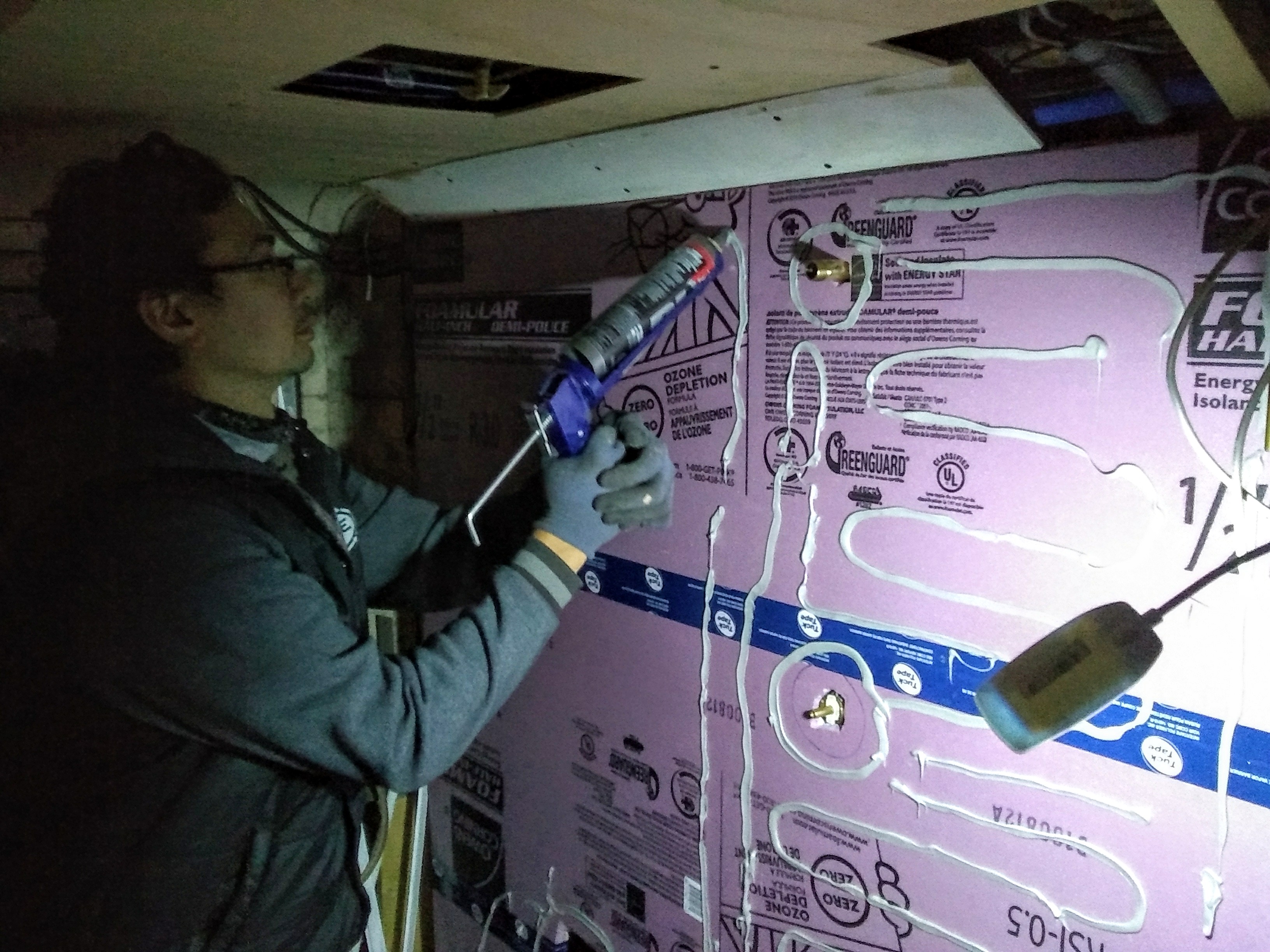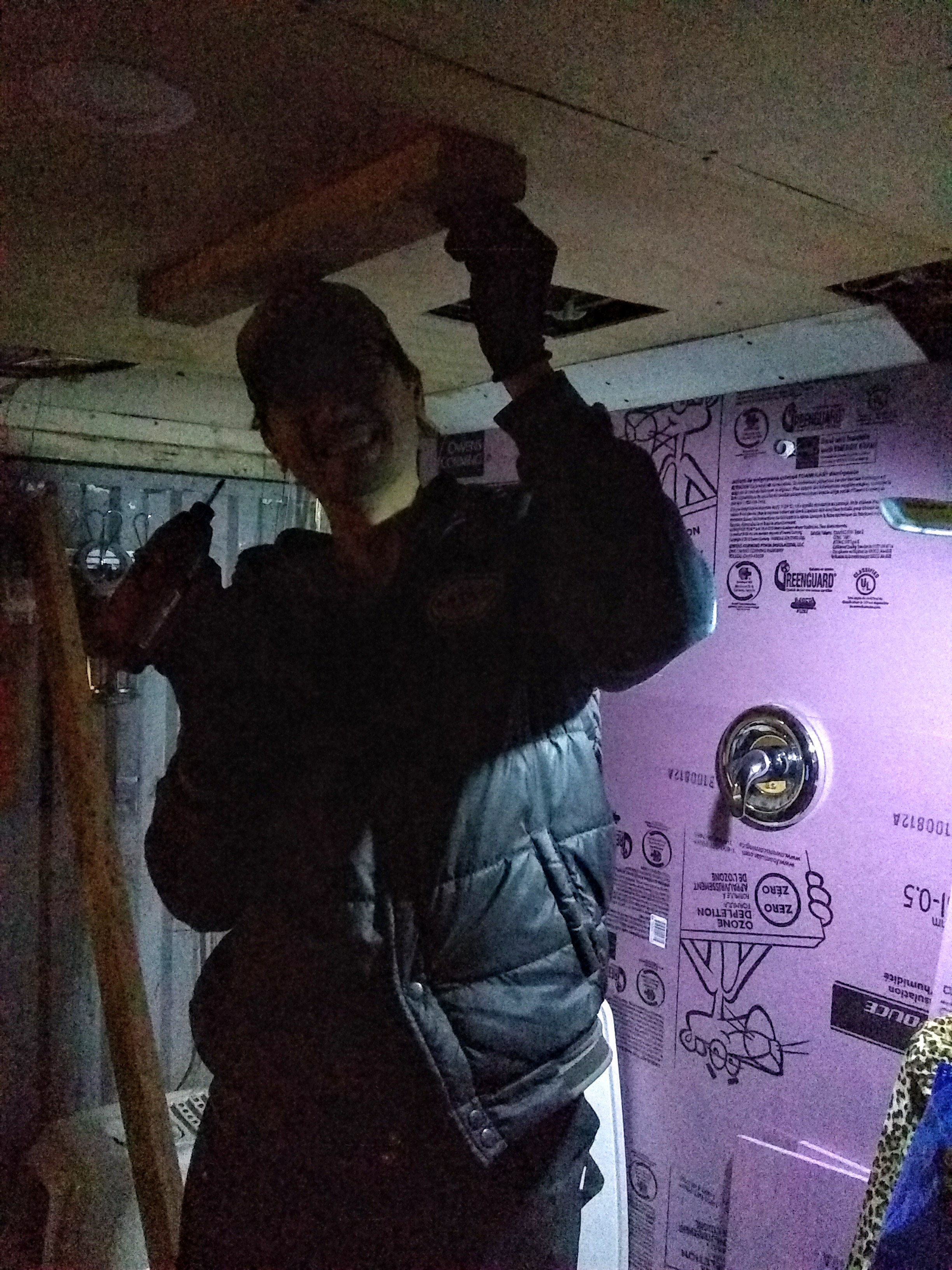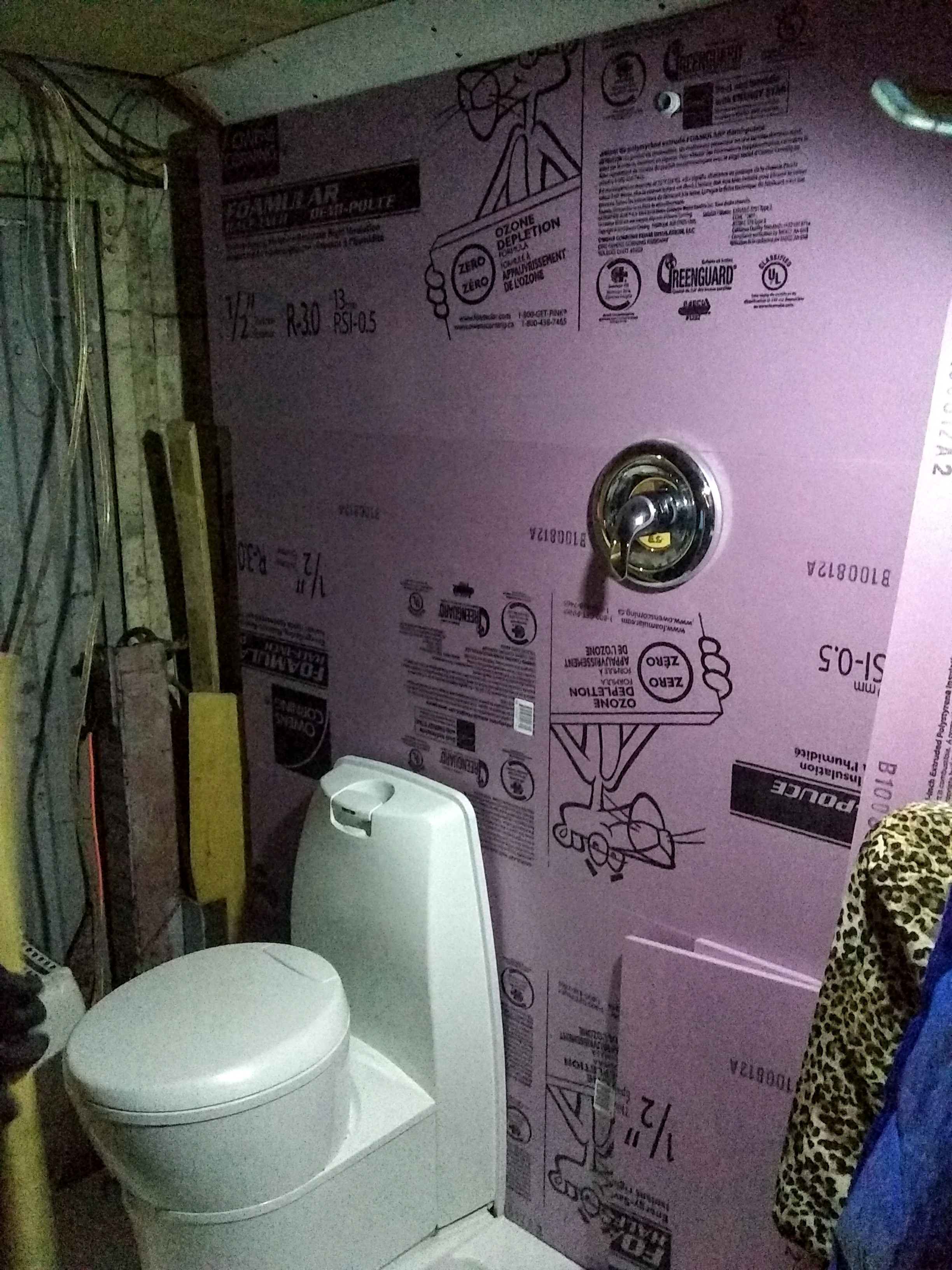 We also added a new frame to our ceiling vent over the stove. And then it was time to tackle the shower wall. We’ve had a working shower throughout, with a shower head that’s been able to spout running, hot water over the course of our trip. The problem is that we hadn’t yet taken the time to figure out how we wanted to waterproof the wall and create a shower curtain track. (And taking our showers in secluded forest areas just isn't going to cut it in the cold weather.) The first problem was deciding on what to use as the waterproof layer: Kerdi-Board, DensShield, and a concrete board (and an additional $95 on a gallon of RedGard as the waterproofing membrane for those last two) were all options. We probably would have gone with the Kerdi-Board if we were going to be tiling our shower wall. But because we decided to go with an FRP (Fiberglass Reinforced Panel) in lieu of tiles, and also wanted something lightweight, we took the advice of the incredibly knowledgeable guy working at Home Depot and went with Foamular Extruded Polystyrene Rigid Insulation. It’s light as styrofoam but it’s also water-resistant and blocks mildew and rot. So we found a parking lot by some baseball fields that happened to be under construction, and we got to work. We cut the Foamular up and glued it to our plywood wall: