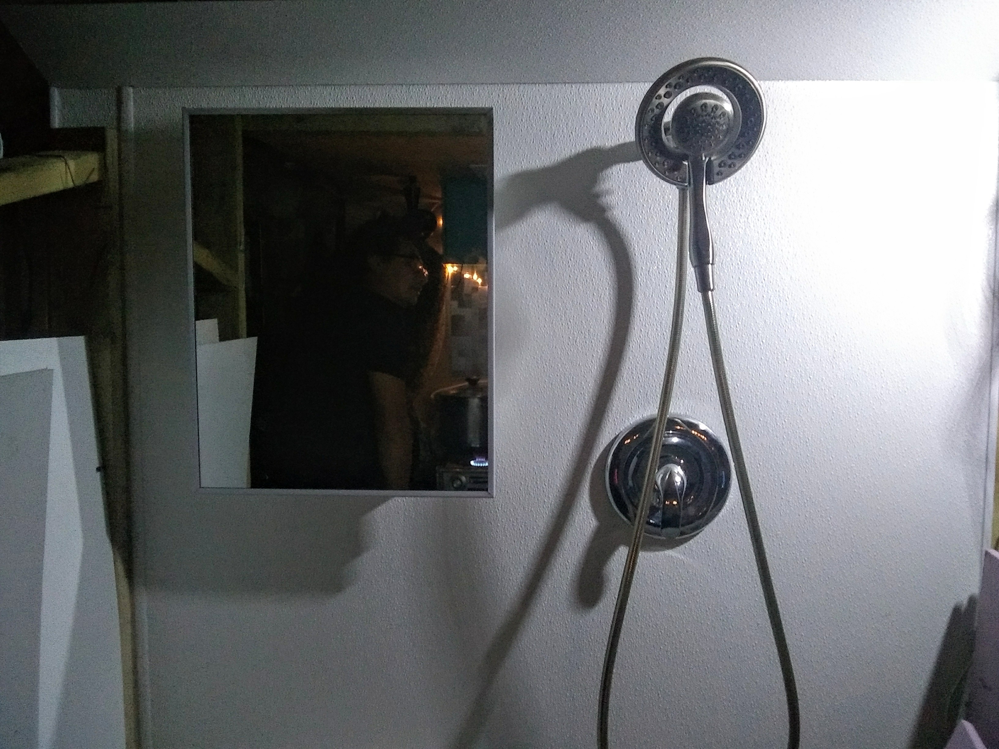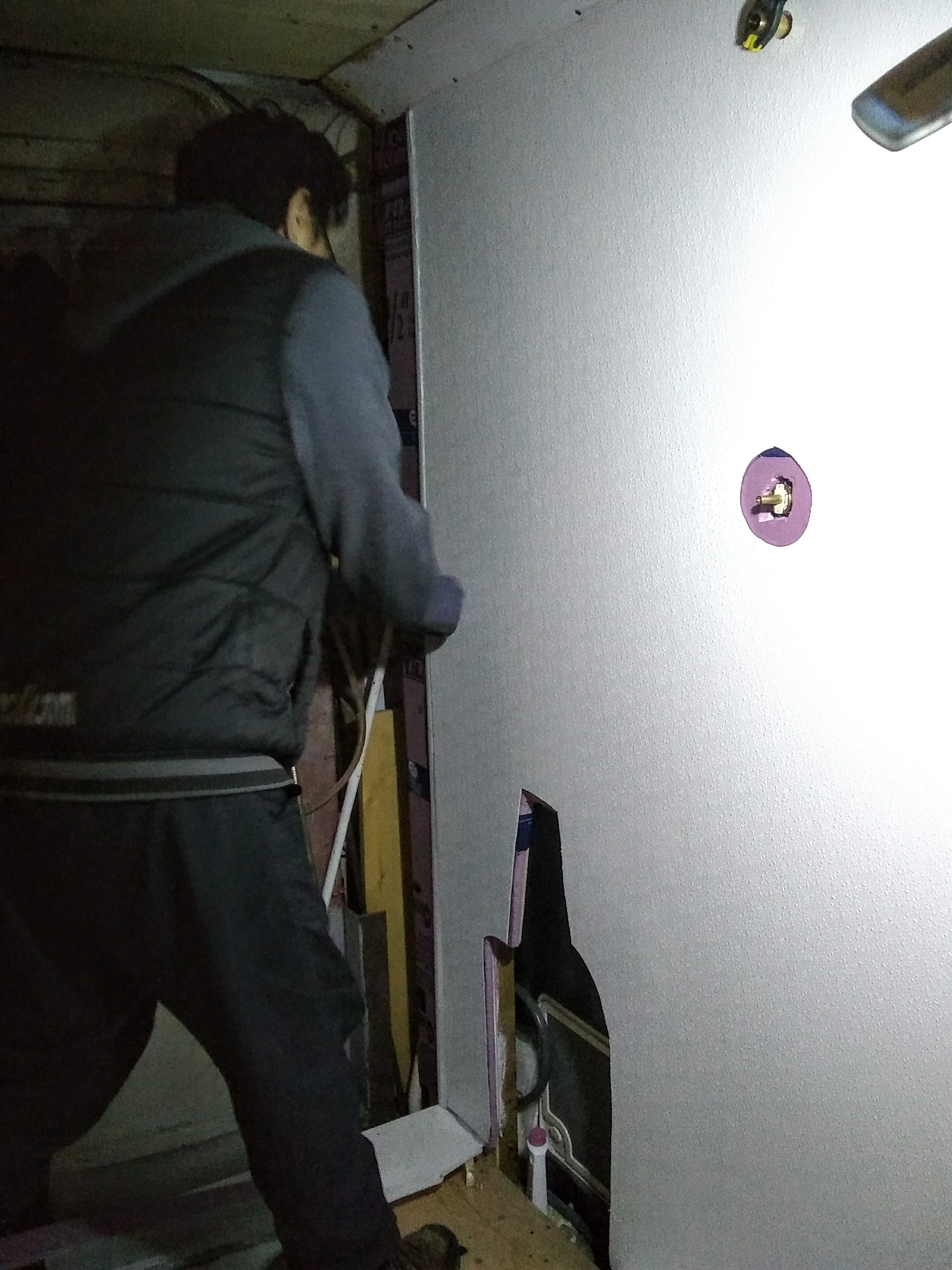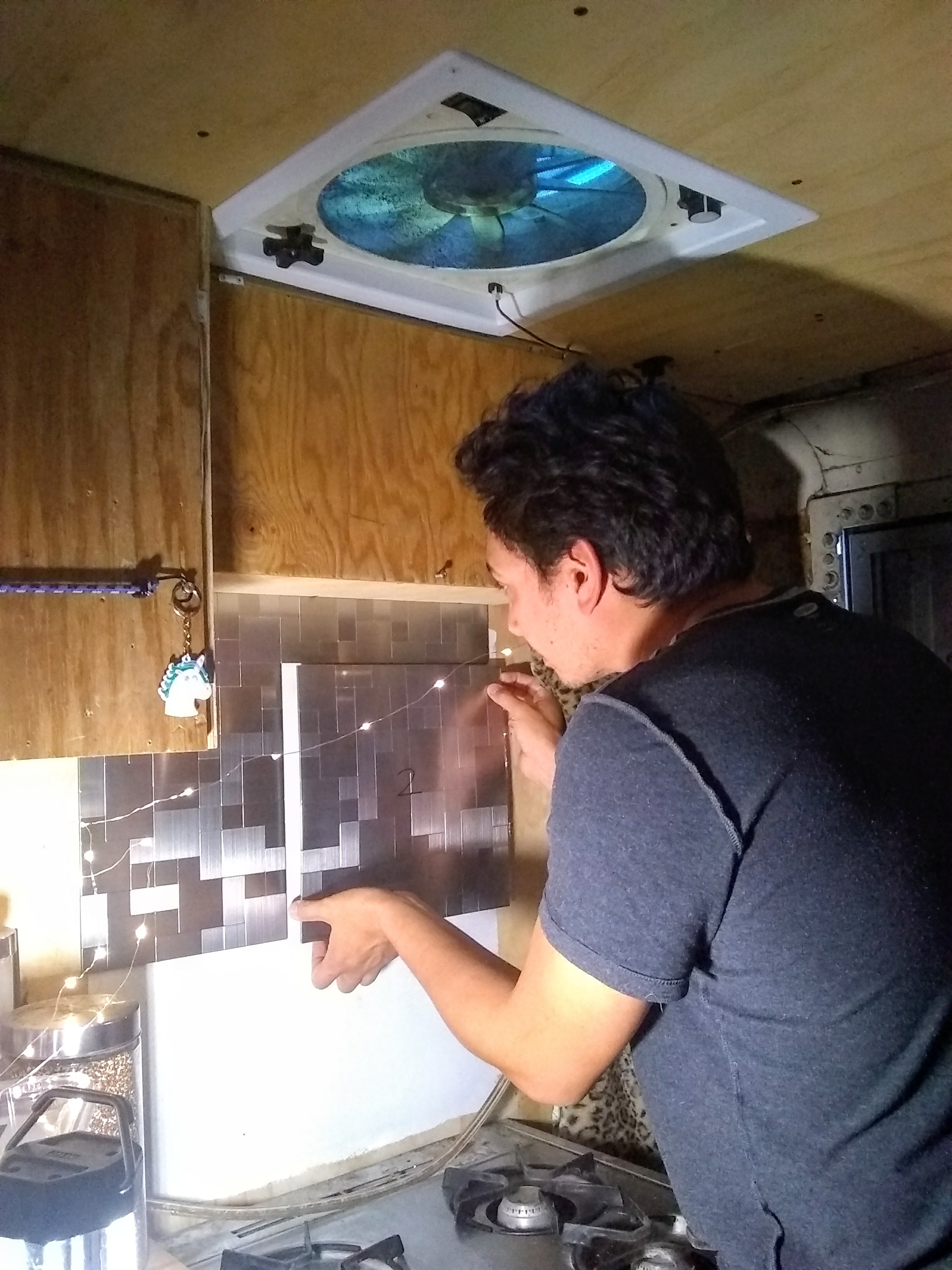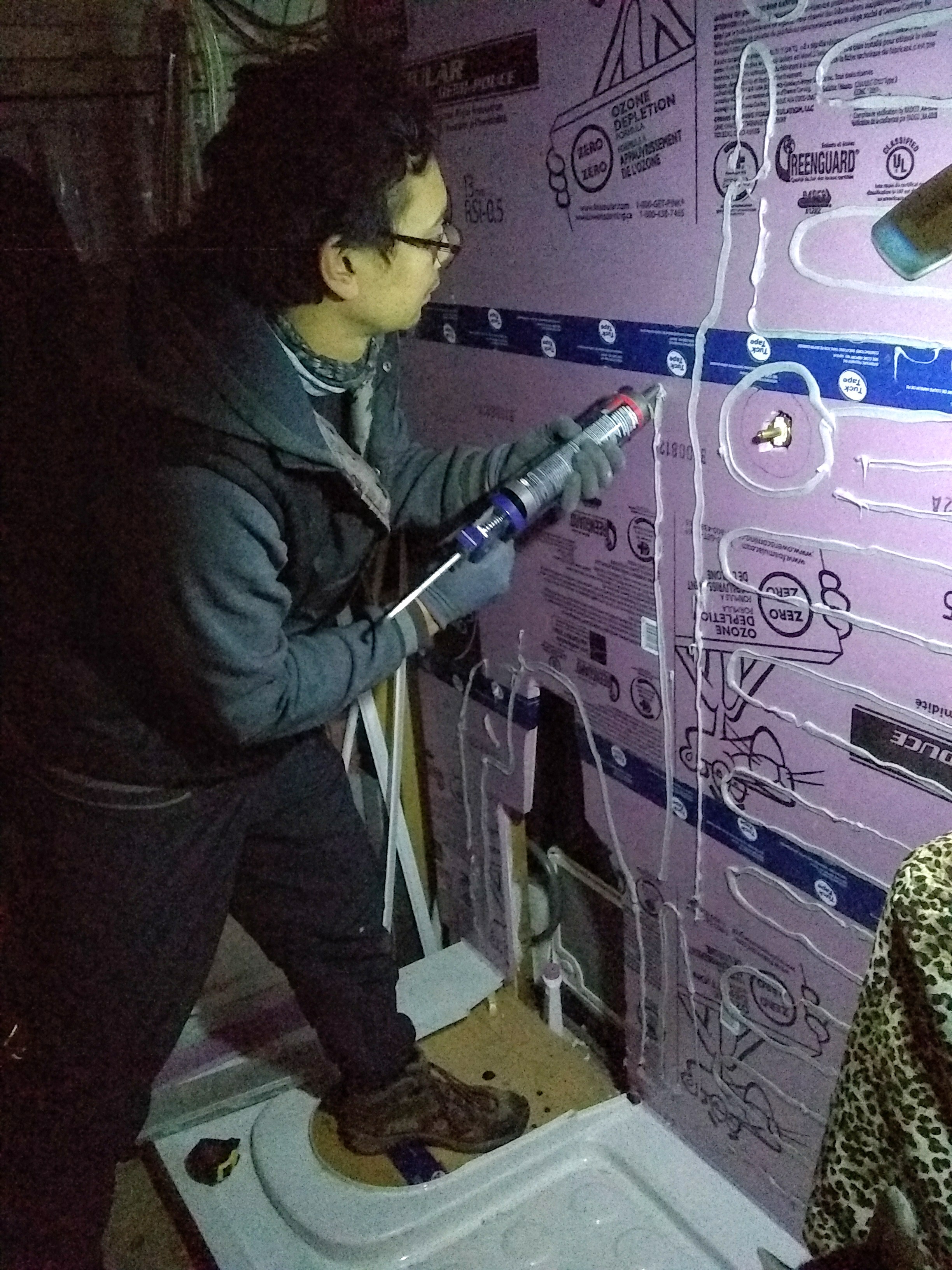 We also added a new frame to our ceiling vent over the stove. And then it was time to tackle the shower wall. We’ve had a working shower throughout, with a shower head that’s been able to spout running, hot water over the course of our trip. The problem is that we hadn’t yet taken the time to figure out how we wanted to waterproof the wall and create a shower curtain track. (And taking our showers in secluded forest areas just isn't going to cut it in the cold weather.) The first problem was deciding on what to use as the waterproof layer: Kerdi-Board, DensShield, and a concrete board (and an additional $95 on a gallon of RedGard as the waterproofing membrane for those last two) were all options. We probably would have gone with the Kerdi-Board if we were going to be tiling our shower wall. But because we decided to go with an FRP (Fiberglass Reinforced Panel) in lieu of tiles, and also wanted something lightweight, we took the advice of the incredibly knowledgeable guy working at Home Depot and went with Foamular Extruded Polystyrene Rigid Insulation. It’s light as styrofoam but it’s also water-resistant and blocks mildew and rot. So we found a parking lot by some baseball fields that happened to be under construction, and we got to work. We cut the Foamular up and glued it to our plywood wall:
