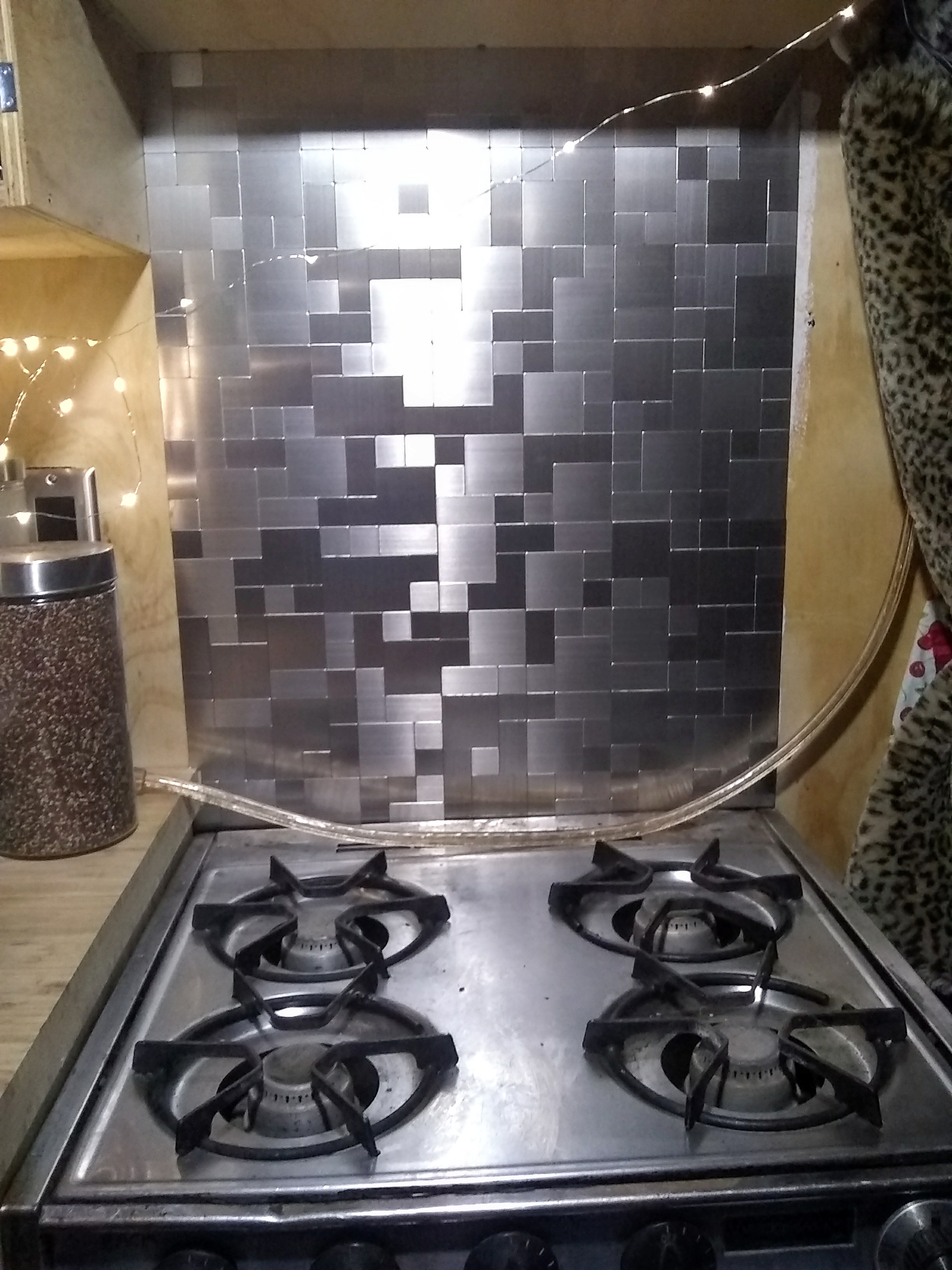 Then we added our metallic peel-and-stick tiles that ordered online to our stove backsplash: