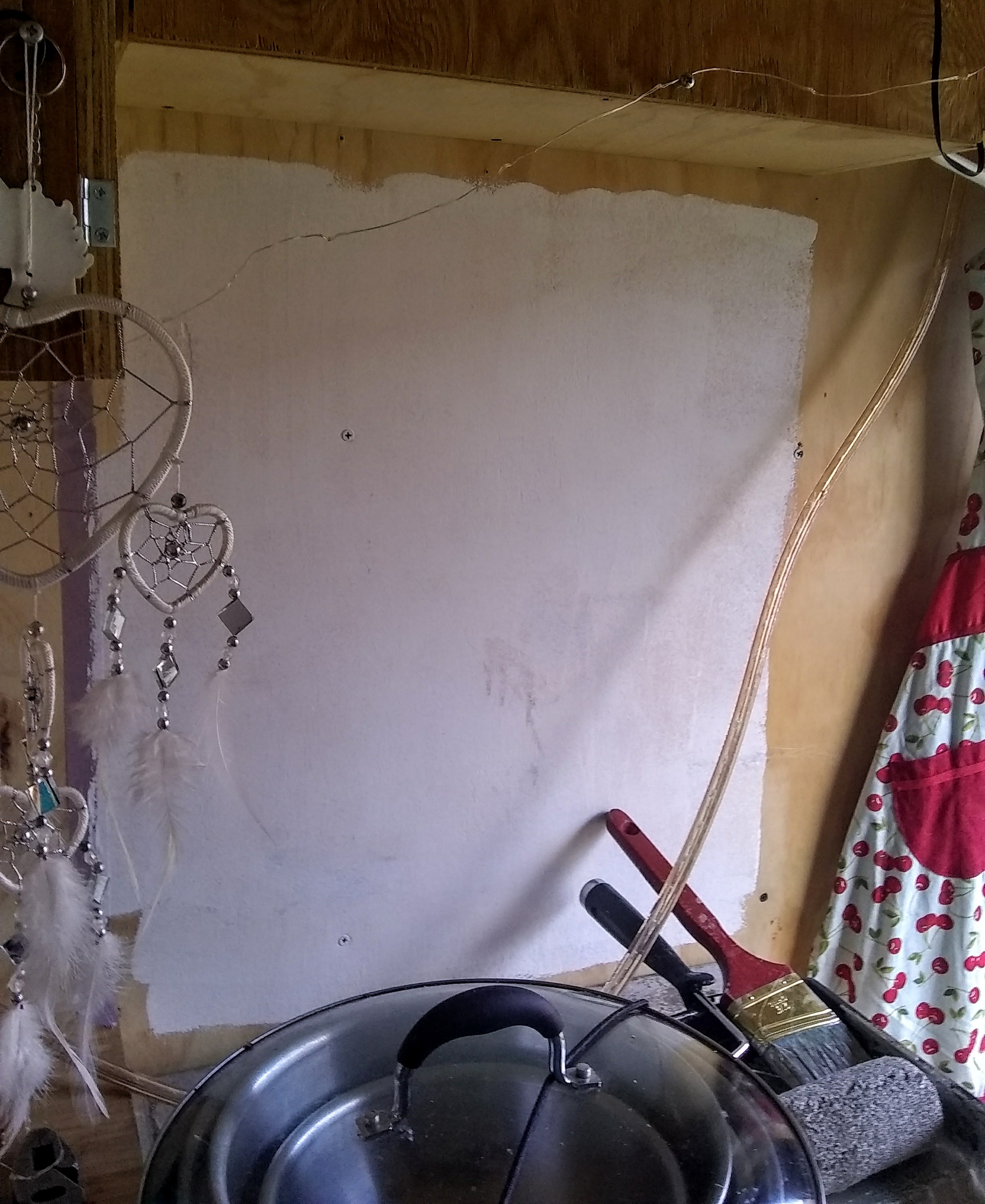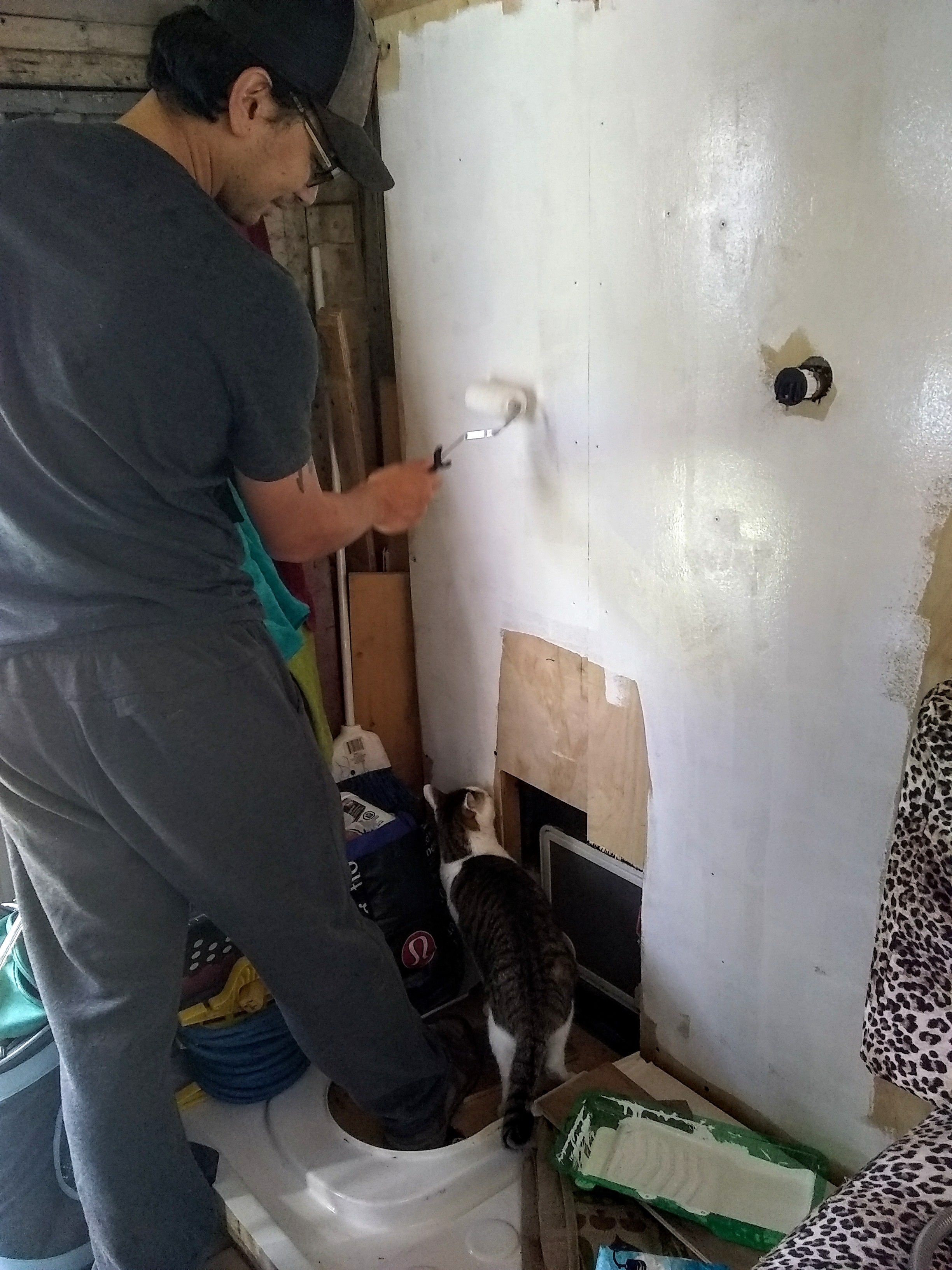 We also picked up some paint to start to jazz up our decor with. First we coated everything with a latex primer, including what is turning into our shower wall and the area behind the stove in preparation for our stick-on tiles: