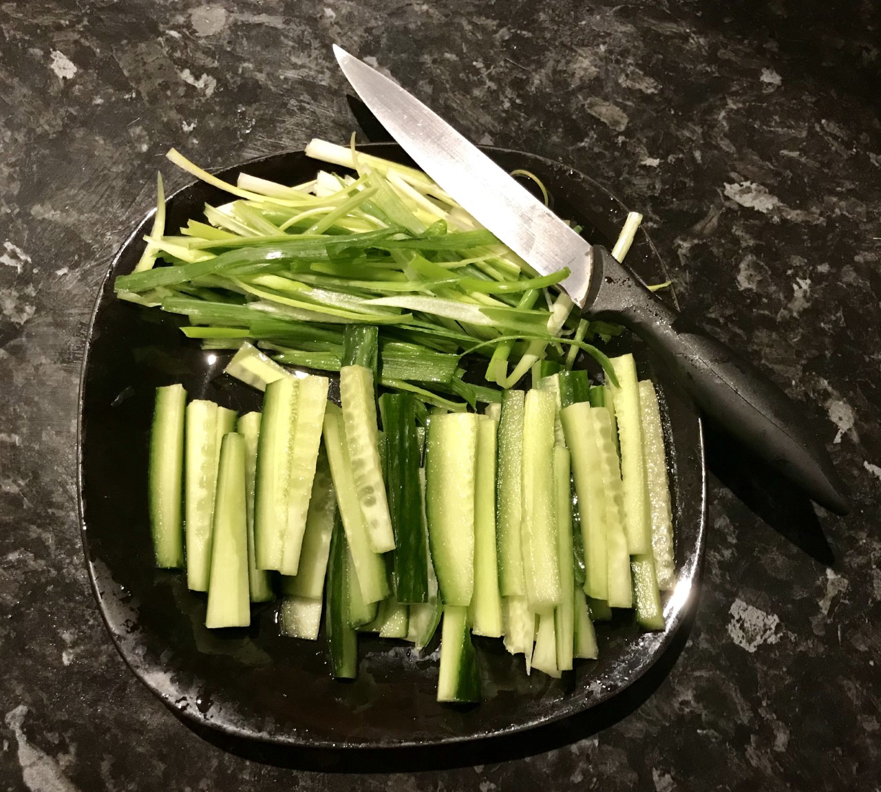 - Thinly slice your cucumber and spring onions.