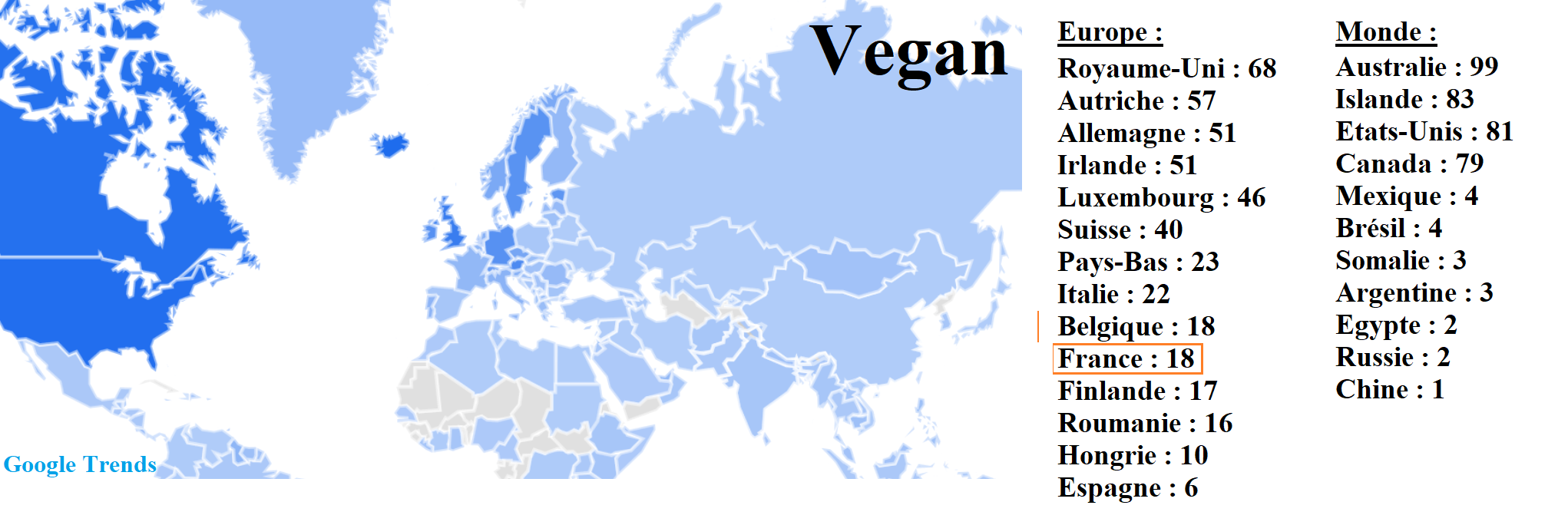 Ainsi l'Australie est l'un des pays présentant le plus de recherches avec le mot "Vegan", alors que la Chine serait l'un des pays présentant le moins de recherches.