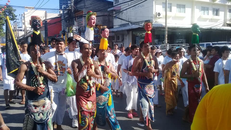 It's a commemoration of a merit making where a community was delivered from a terrible plague. The re-enactment of suffering increases the merit made by eating "jay" (vegetarian) for the ritual 9 days to honour the Buddha. It's one of those quirky things where the animist heart of real Thailand is dressed up as Buddhism and vegetarianism.
