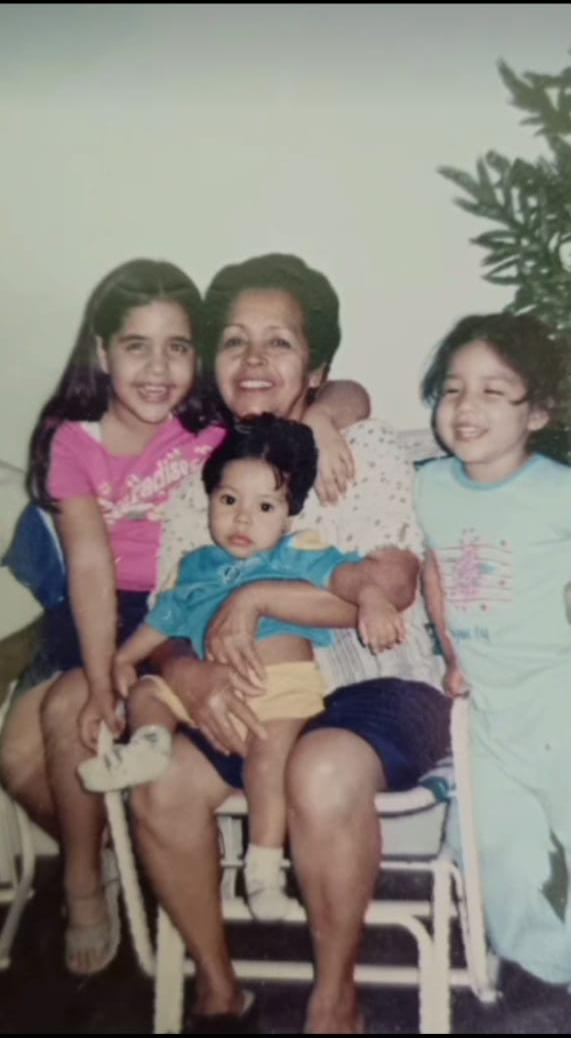 En primera fotografía la verdad es muy hermosa, donde se muestra una abuela consentidora y sus tres primeros nietos, el cuarto nieto nació muchos años más tarde. En esta imagen aparece la señora Ángela mi madre, mi sobrina Mariángel, que es la única hija de mi hermana, mi hija Andrea y mi hijo Saúl Andrés, sus edades eran en ese entonces aproximadamente, seis meses mi hijo, mi hija unos cuatro años mi sobrina tendría unos siete años para ese momento, fue tomada en el porche de la casa de mis padres. Por eso dicen que recordar es vivir y gracias a las fotografías podemos recordar momentos bellos con nuestros hijos y con mi madre.
