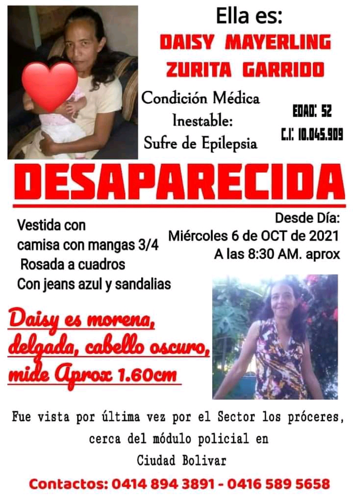 Amiga soy de Ciudad Bolívar, voy a difundir la foto con algunas amistades que tengo en los proceres.. Fuerza y Fe en que Dios mediante aparecera