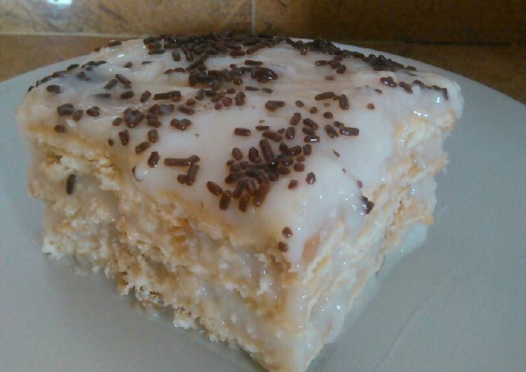 3_Armado: en un molde coloca una capa de la mezcla licuada en el fondo y luego una capa de galletas ligeramente remojada en la media taza de leche fría. Luego otra capa de crema y otra de galletas remojadas.