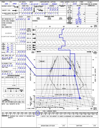 Todos estos pesos se planifican y calculan de forma muy cuidadosa en un formato internacional mente legal y de carácter oficial, tanto asi que cada vez que hay un accidente aereo, lo primero que se revisa es el documento de los calculos de peso y balance, el cual les muestro a continuacion, primero en blanco y luego debidamente lleno: