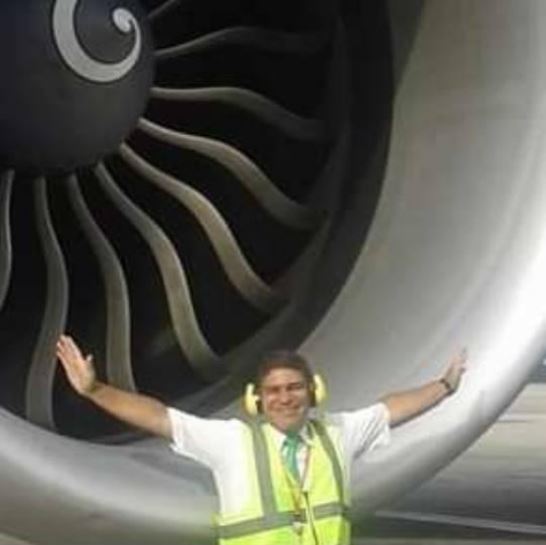 Yo frente a los motores apagados de un Boeing 777-300ER, foto tomada con mi camara NIKON.