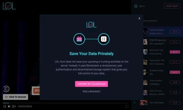 LOL Hunt is a website that shows daily top chart for funny YouTube video. LOL hunt allows you to share and upvote videos,also it makes use of decentralized storage on Blockstack in storing users data.