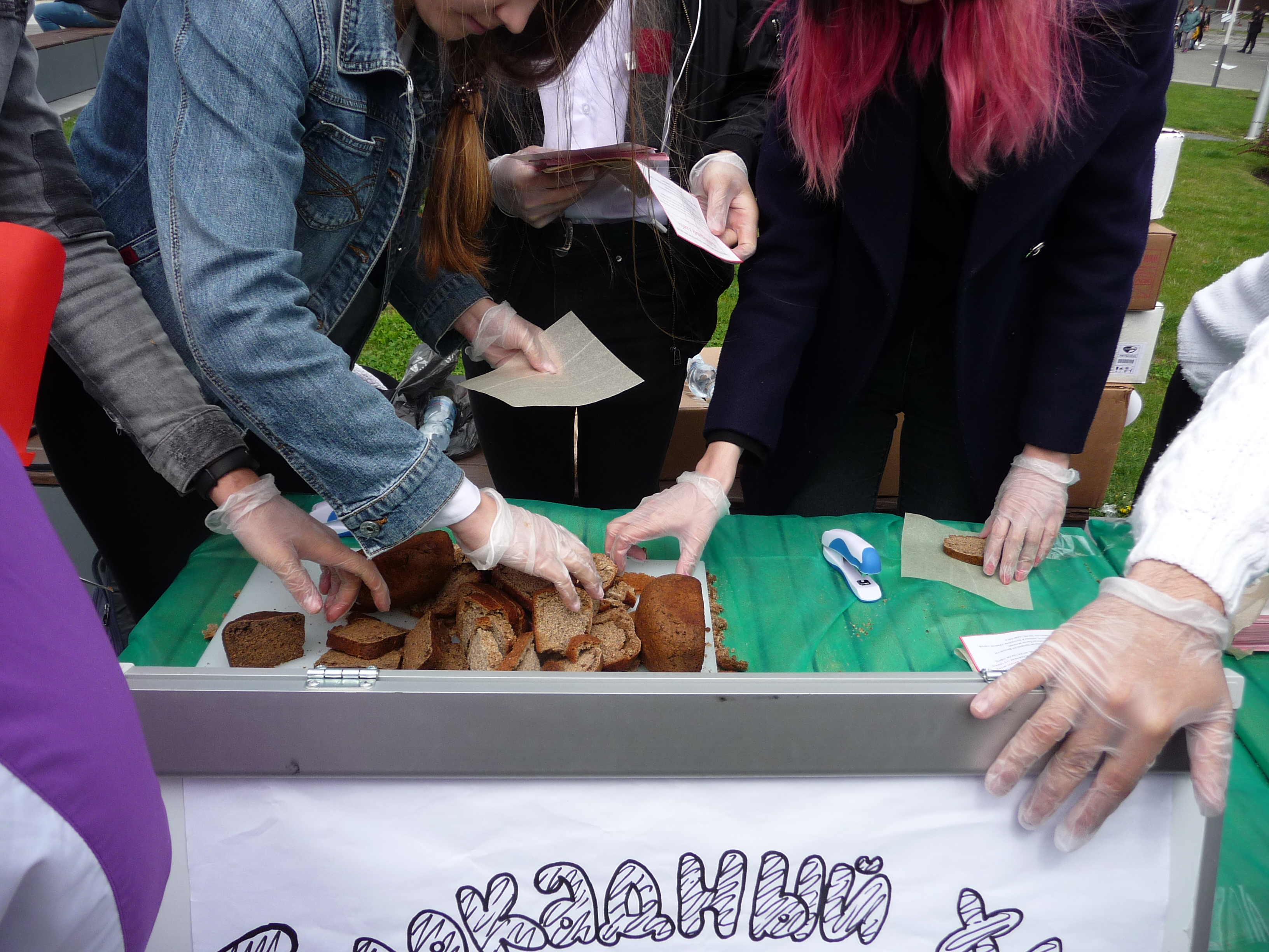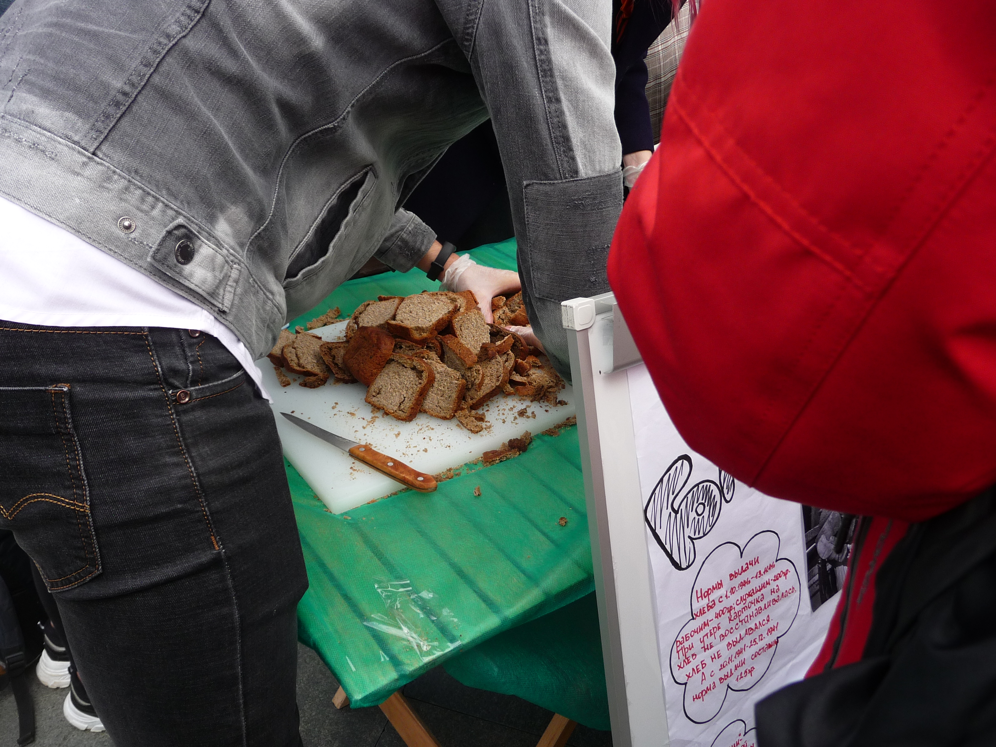 Near the fountain, the youth distributed to people portions of blockade bread trying to convey the atmosphere of that difficult wartime.