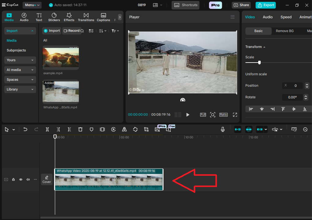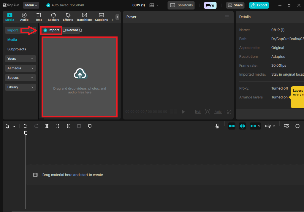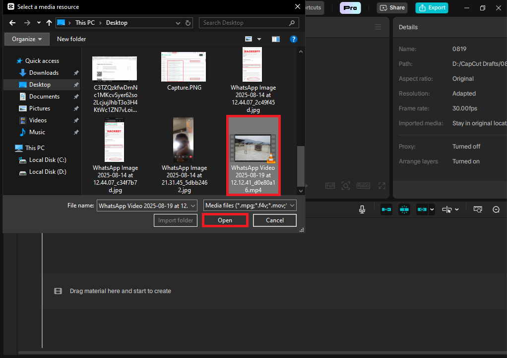 - In this first step, I have to import videos to Capcut, so for this, I click on the Import option as underlined, and after clicking on it, I then select the video, and after selection, I then click on open. After that, the video that I want to edit will be imported to my CapCut.