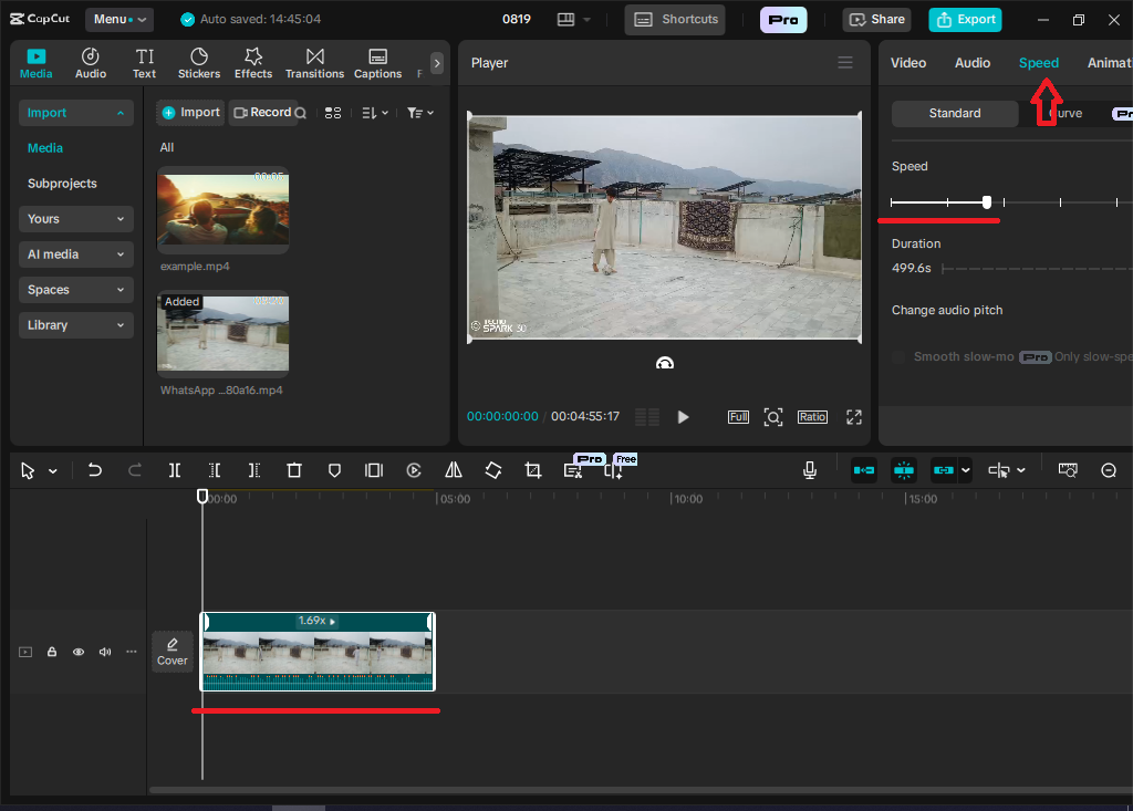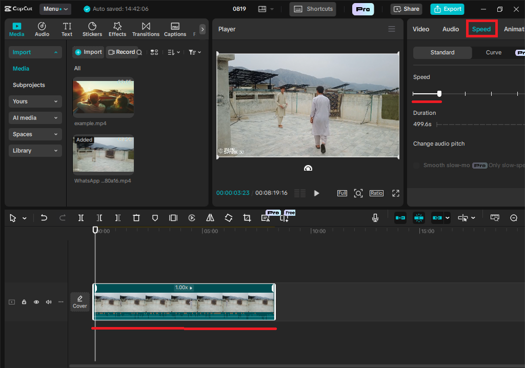 - In the third step, I've sped up the duration of the video. So for speeding it, first I have to click on the video on the timeline, and after that another small interface will be opened in the top left corner, and from there we can see that there is an option for Speed, as I have underlined it too. So for speeding up the video, you have to click on it, and after clicking there will be something opens like a line, so if you drag the point on the right side, then your video will be slower, but if you drag the point on the left side, then the speed of the video would be faster. So I want to speed up the video, so I drag the point to the left.