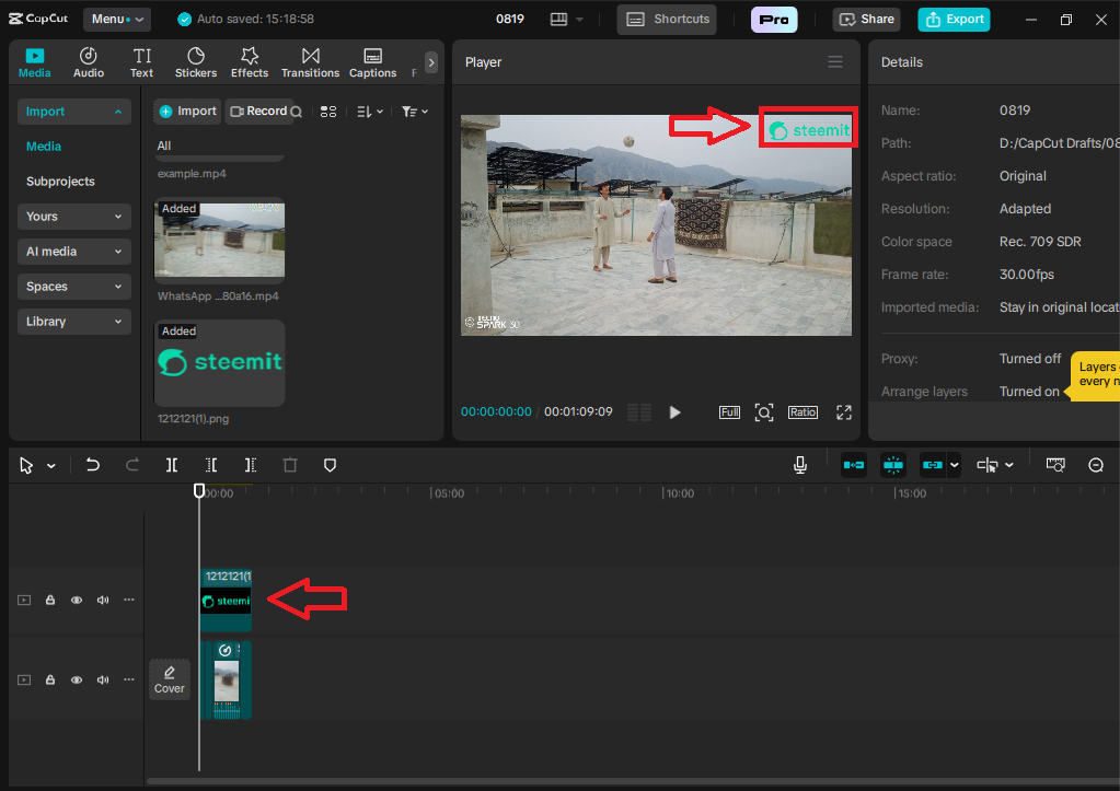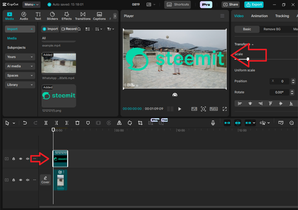 In the fifth step, I have to add an overlay of the Steemit logo, so for that, I have to import the overlay, and after adding it, I then adjust its position according to my video. I put the Steemit logo in the top left corner of my video. After adding the overlay and adjusting i,t I then adjusted the overlay in the timeline too.
