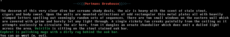 Pretty straight forward right? We can also make out at the very bottom any obvious exits that exist in the room we are in. From here we have a number of options, as you will have learned if you caught my @libdus announcement there is a really cool command called emote that lets you portray your character as doing something, in that you get to write out the message of the thing that you would like them to do. The emote and they say command go hand in hand to allow you to craft your character into a fully live and vibrant creature of whatever world you might be playing in. Of course along with many other commands as well.