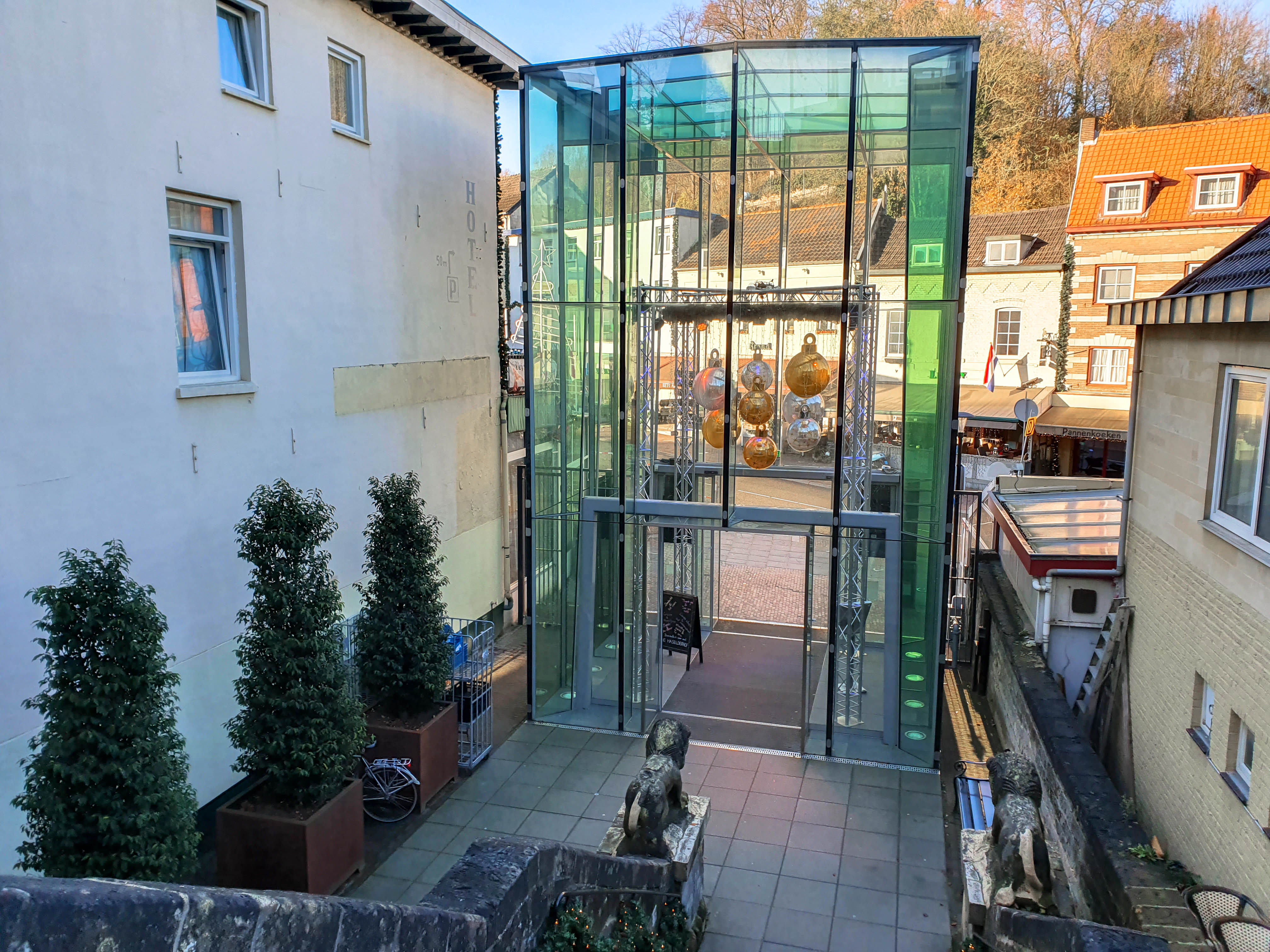 Behind the glass construction is medieval staircase leading you up to the castle and the restaurant. On the right side of the staircase is a lift in case you are not able to walk up the stairs.