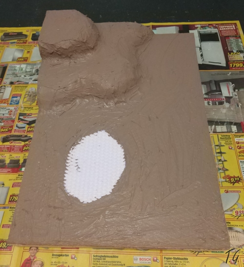 Then I mixed some filler (this one) with brown color to make the base layer and fill the surface. I applied it mostly with my hands (wear gloves) to create an uneven look and spared the space where the harpy / hive crown base will be placed to make it easier to cut. This space will not be visible anyway.