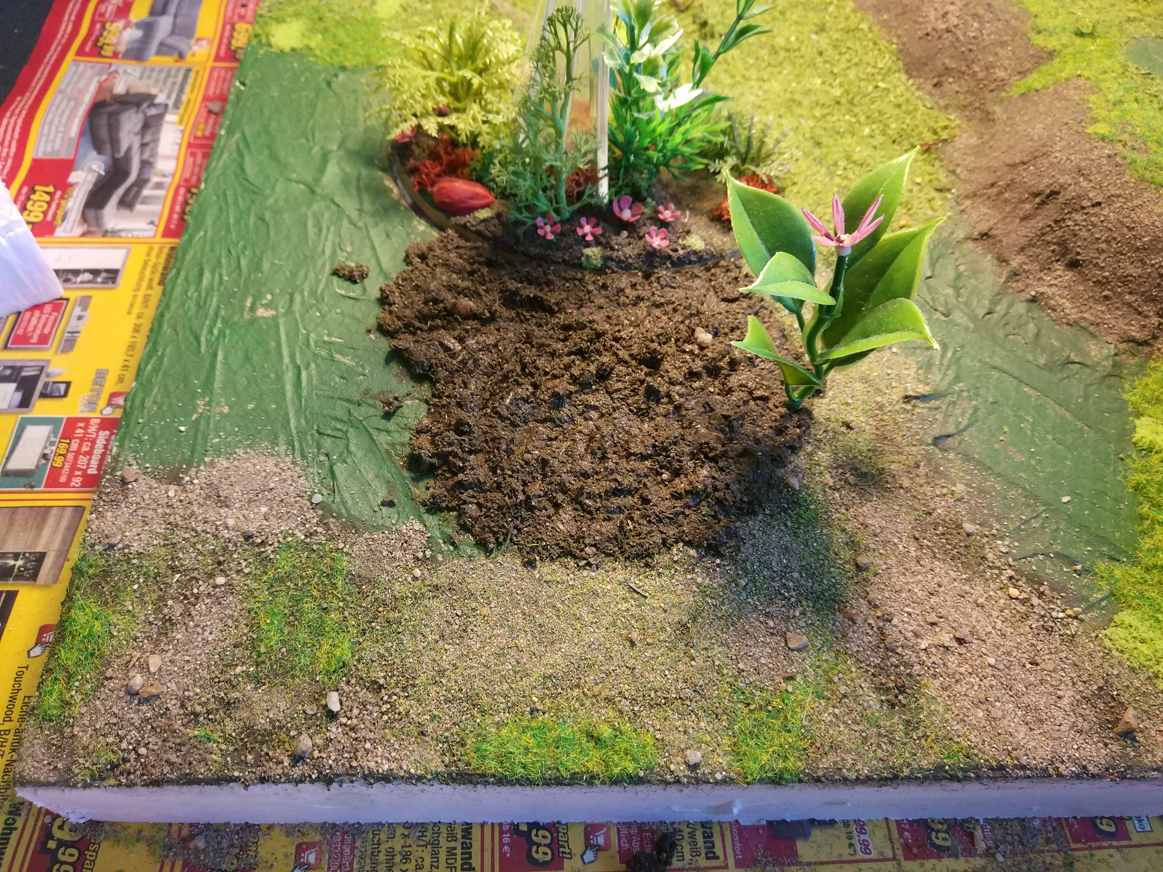 Later on I started gluing the static grass, soil and so on. I did a test fit of the different jungle plants I made earlier, too. To ensure all the miniatures will fit, I regularly put them on the board. For the muddy area I mixed glue, soil, color, water, sand, static grass, scatter material(?) and flock together. I also added some cheap putty that gets very slimy with water. I applied the mud with wood sticks and an old paint brush (it is a very crumbly paste, it sticks together fine, but not that good at another surface unless dried).