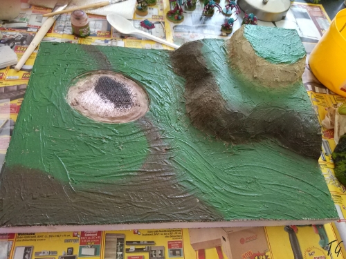 Once dried I applied base coats of color, green where the grass will go, brown for the soft hill and path area, bone color for the stone hill side. The brown is needed because the filler dried very very light brown.